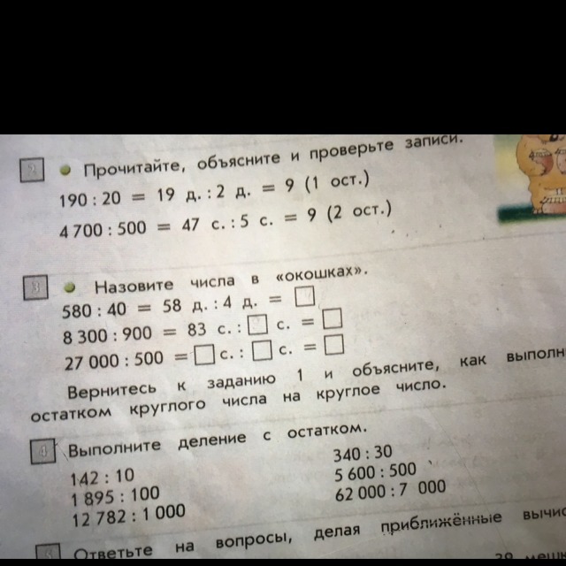 Выполни деление с остатком. 142 : 10 = 1895 : 100 = 12 782 : 1 000 = 340 : 30 = 5 600 : 500 = 62 000 : 7 000 = 290 : 40 = 5000 : 600 = 30 000 : 4 000