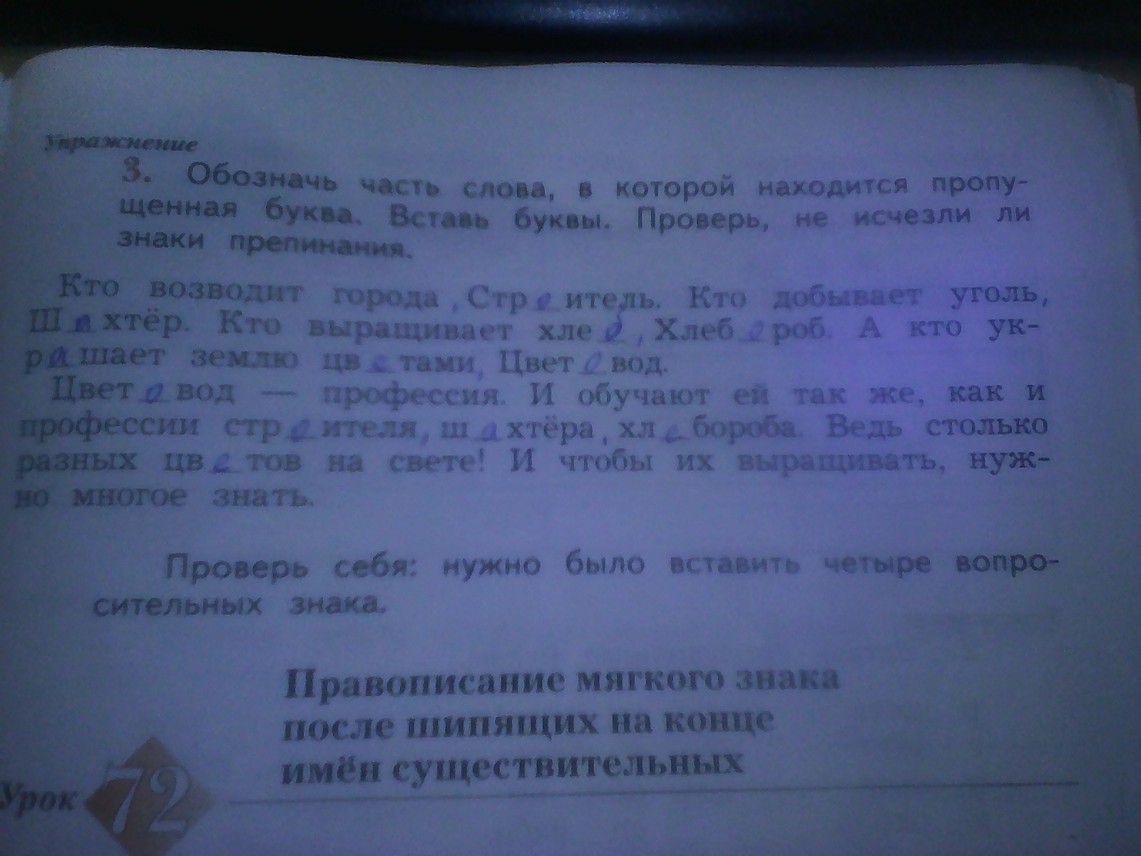 обозначь часть слова, в которой находится пропущенная буква. Вставь буквы.Проверь, не исчезли ли знаки препинания ( номер 3)
