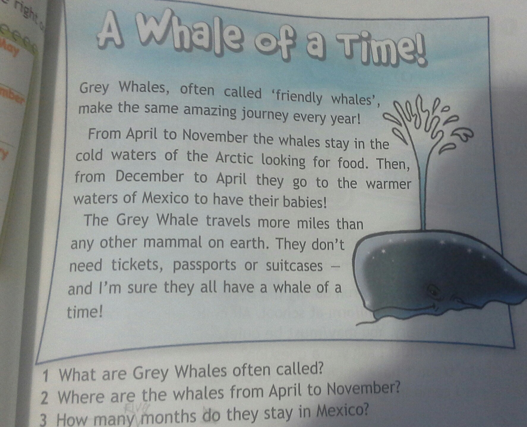 Серые киты, которые часто называют «дружественными китами», совершают одно и то же удивительное путешествие каждый год. С апреля по ноябрь киты остаются в холодных водах А / П в Арктике и ищут еду. Затем с декабря по апрель они отправляются в более теплые воды Мексика, чтобы иметь своих детей! Серый кит путешествует больше миль, чем любое другое млекопитающее на земле. Им не нужны билеты, паспорта или чемоданы, и я уверен, что у всех у них есть кит времени! 1 Что часто называют серыми китами? ? 2 Где киты с апреля по ноябрь? 3 Сколько месяцев они остаются в Мексике?