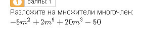 3)-5m^2+2m^5+20m^3-50=-m^2(5-2m^3)-10(5-2m^3)=(-m^2-10)(5-2m^3)