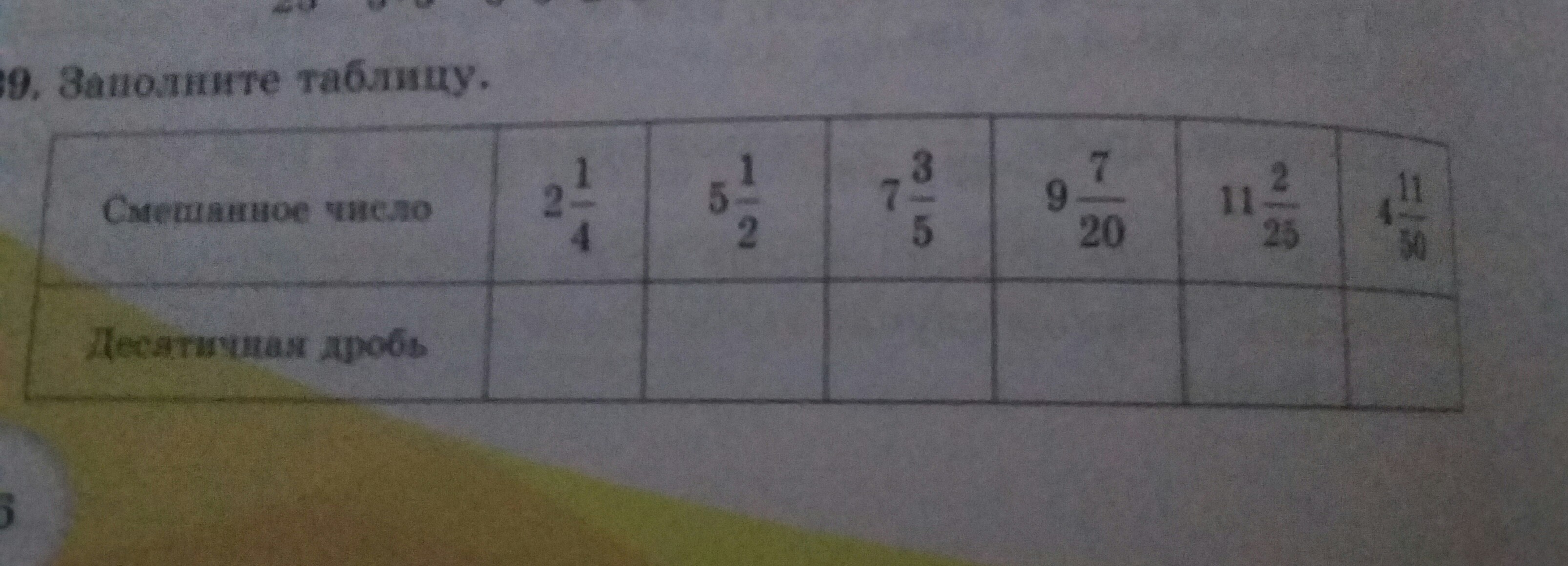 заполните таблицу. смешанное число 2 1/4; 5 1/2; 7 3/5; 9 7/20; 11 2/25; 4 11/50; десятичная дробь? помогите пожалуйста