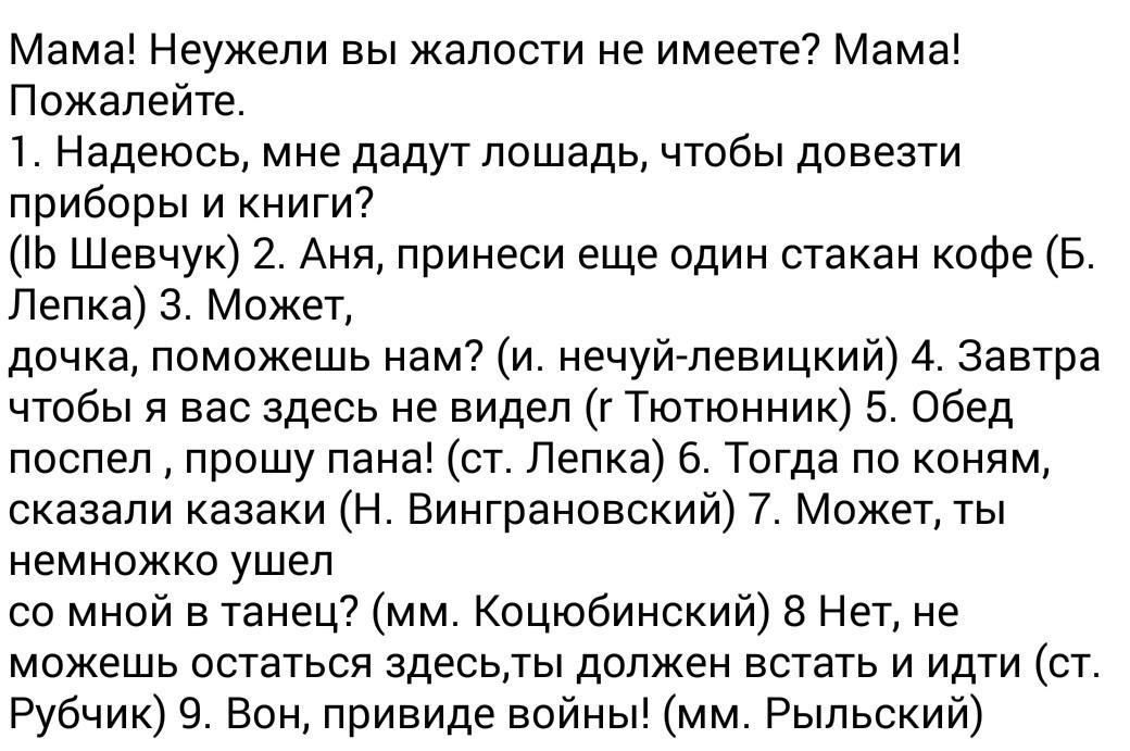 1. Дайте мне лошадь. 3. Помоги нам. 4. Уйдите отсюда завтра. 5. Дайте пана. 6. Садитесь по коням. 8. Встань и уйди. Уйдите