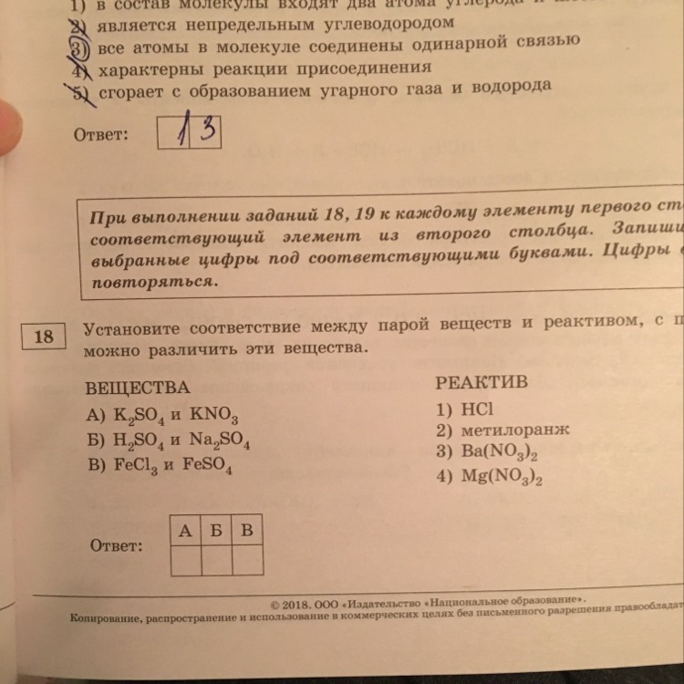 установите соответствие между веществами и реактивом с помощью которого можно различить эти вещества ВЕЩЕСТВА А)K2SO4 и KNO3 Б)H2SO4 и Na2SO4 В) FeCl3 и FeSO4; РЕАКТИВ 1)HCl 2)метилоранж 3) Ba(NO3)2 4)Mg(NO3)2