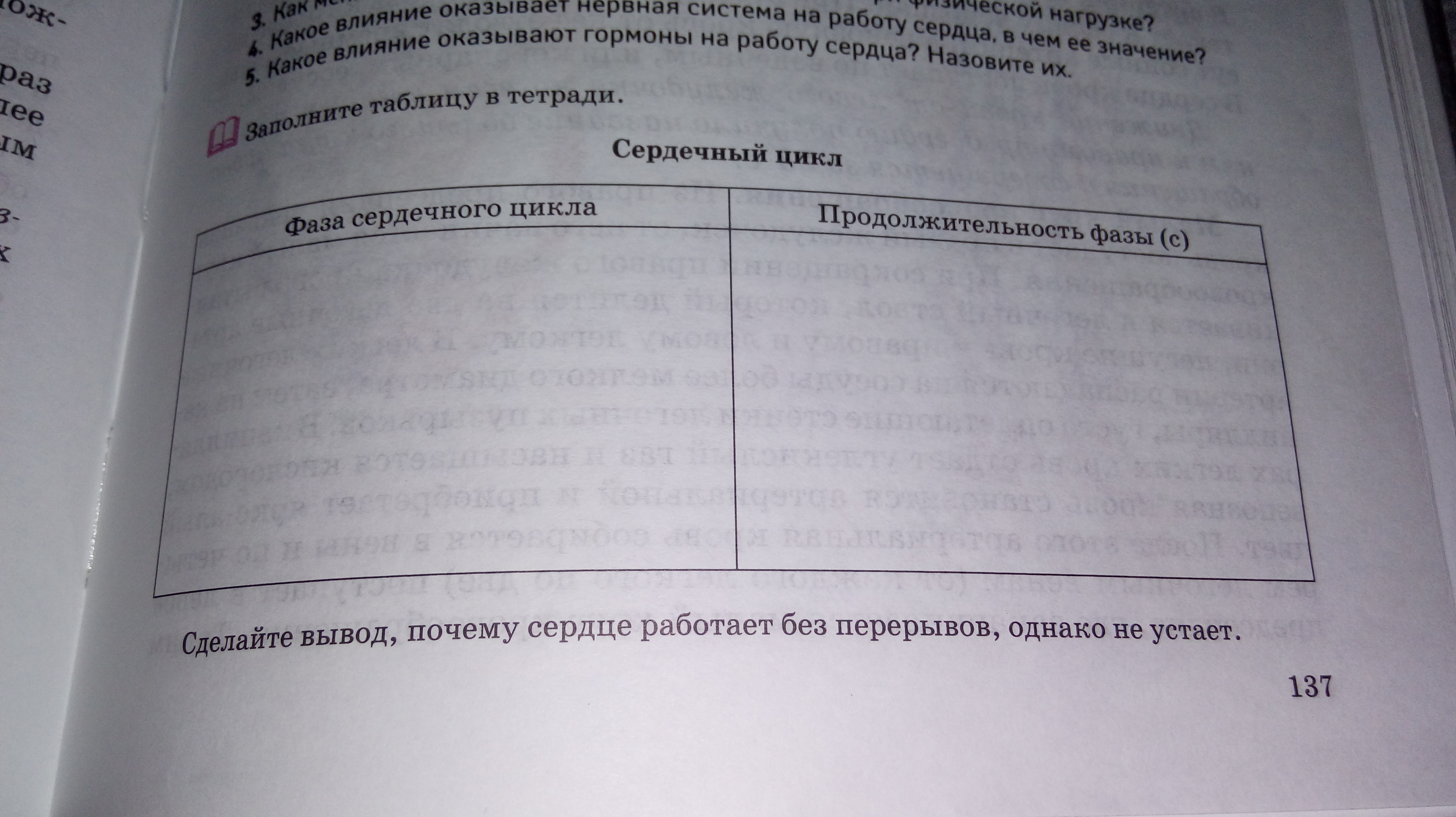 Заполните таблицу. Сделайте вывод, почему сердце работает без перерывов, однако не устаёт.