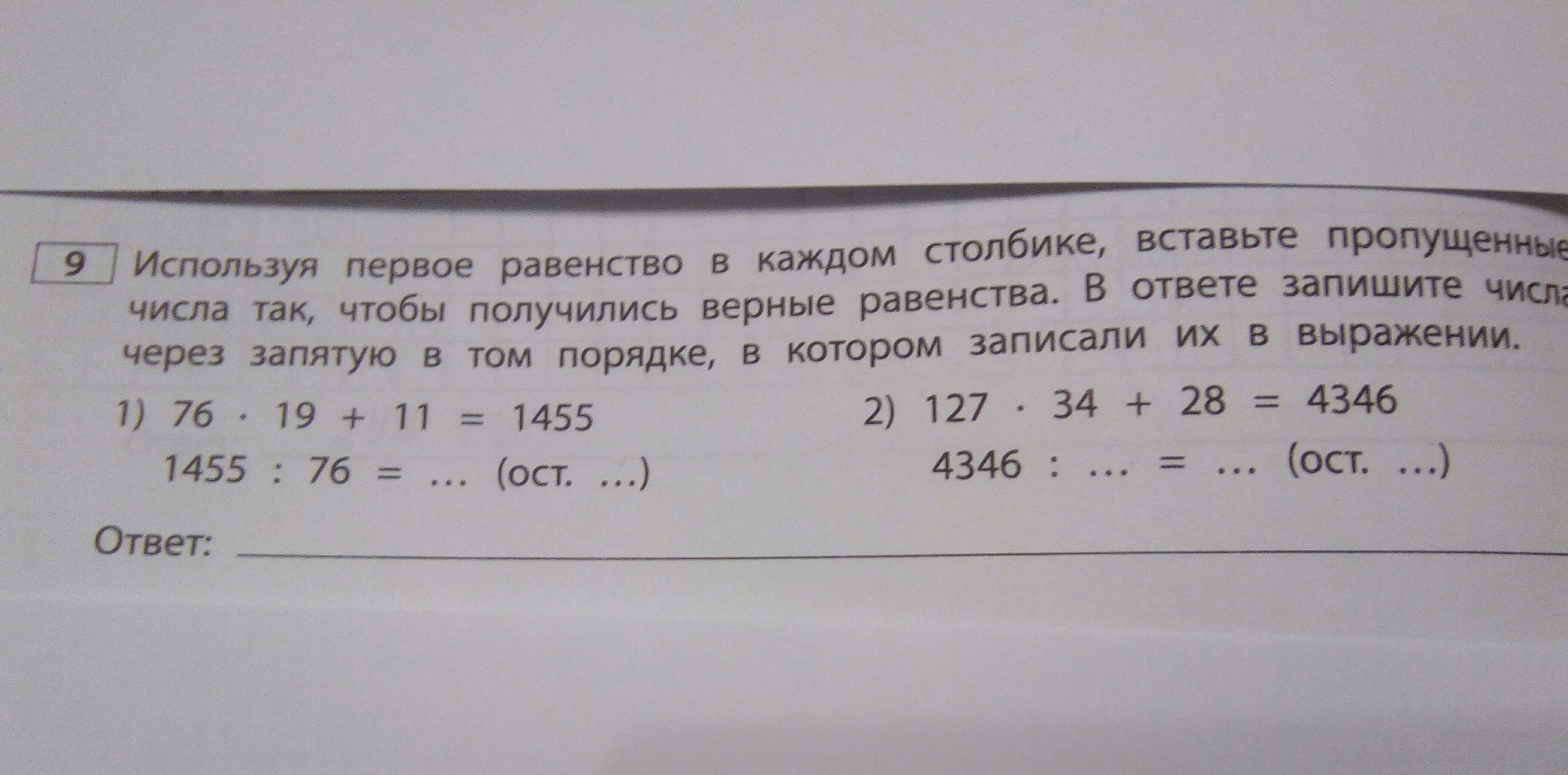 Используя первое равенство в каждом столбике,вставьте пропущенные числа так, чтобы получить верные равенства.1) 76×19 +11=1455....