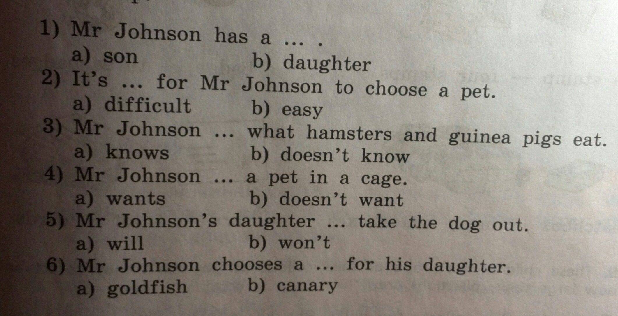 6) Мистер Джонсон выбрал а) золотую рыбку б) канарейку для его дочери.