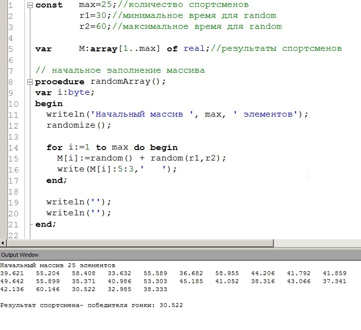 В массиве хранится информация о результатах 25 спортсменов, участвовавших в лыжной