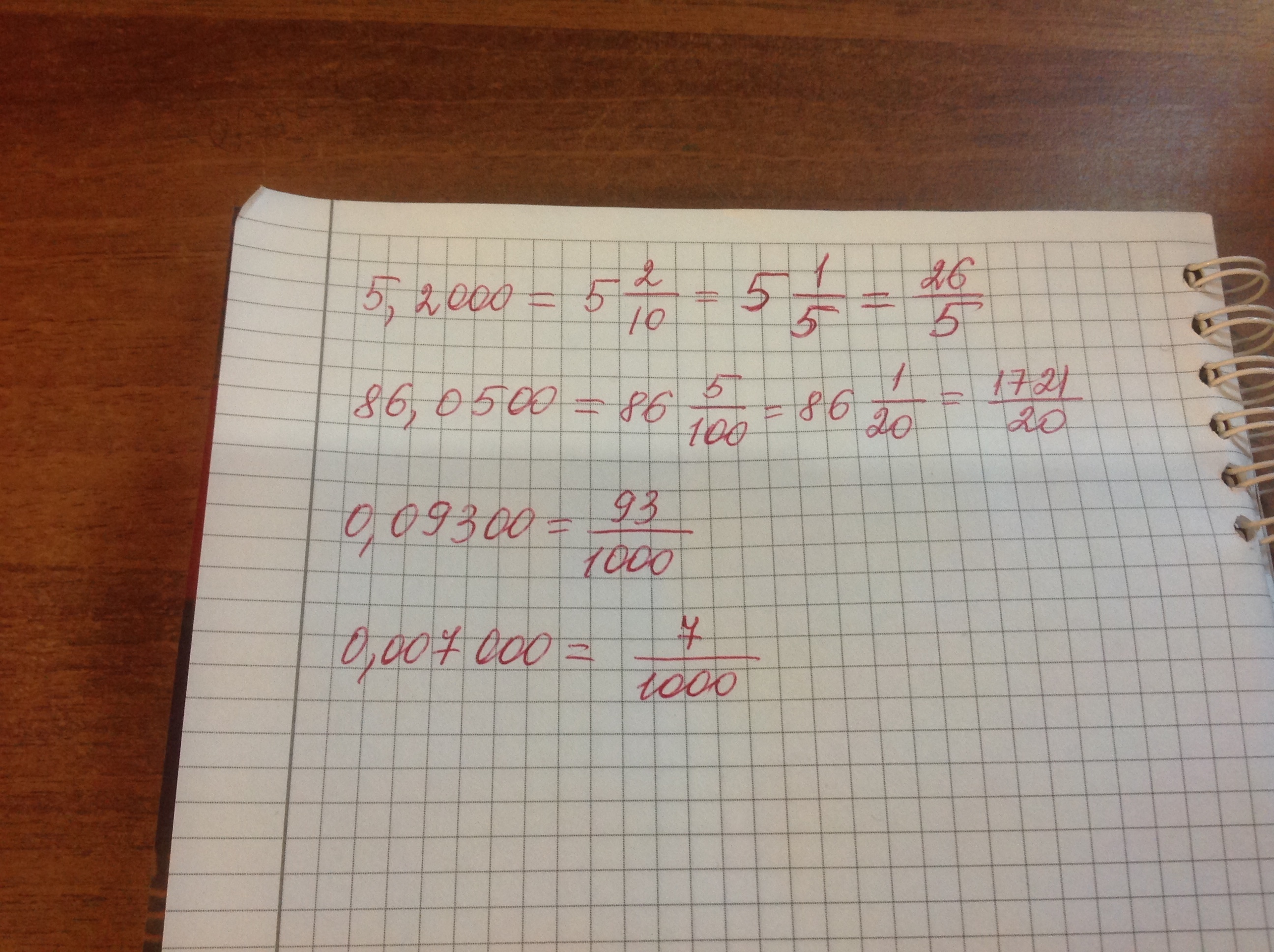 Замените данную десятичную дробь равной ей дробью: 1) 5,2000; 2) 86,0500; 3) 0, 09300; 4) 0, 007000. Запишите результат в виде равенства. Спасибо заранее.