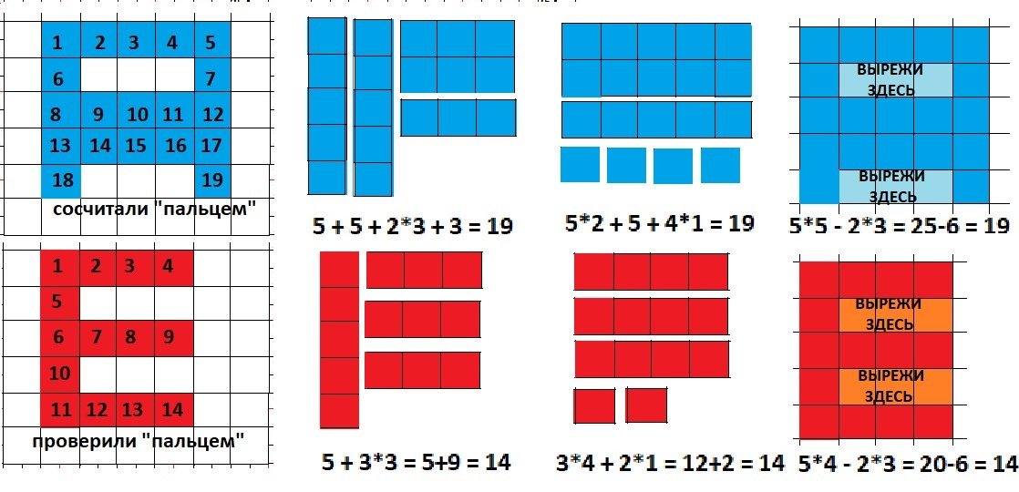 Мысль 2 - это квадраты или прямоугольники. Площадь прямоугольника по формуле S=a*b