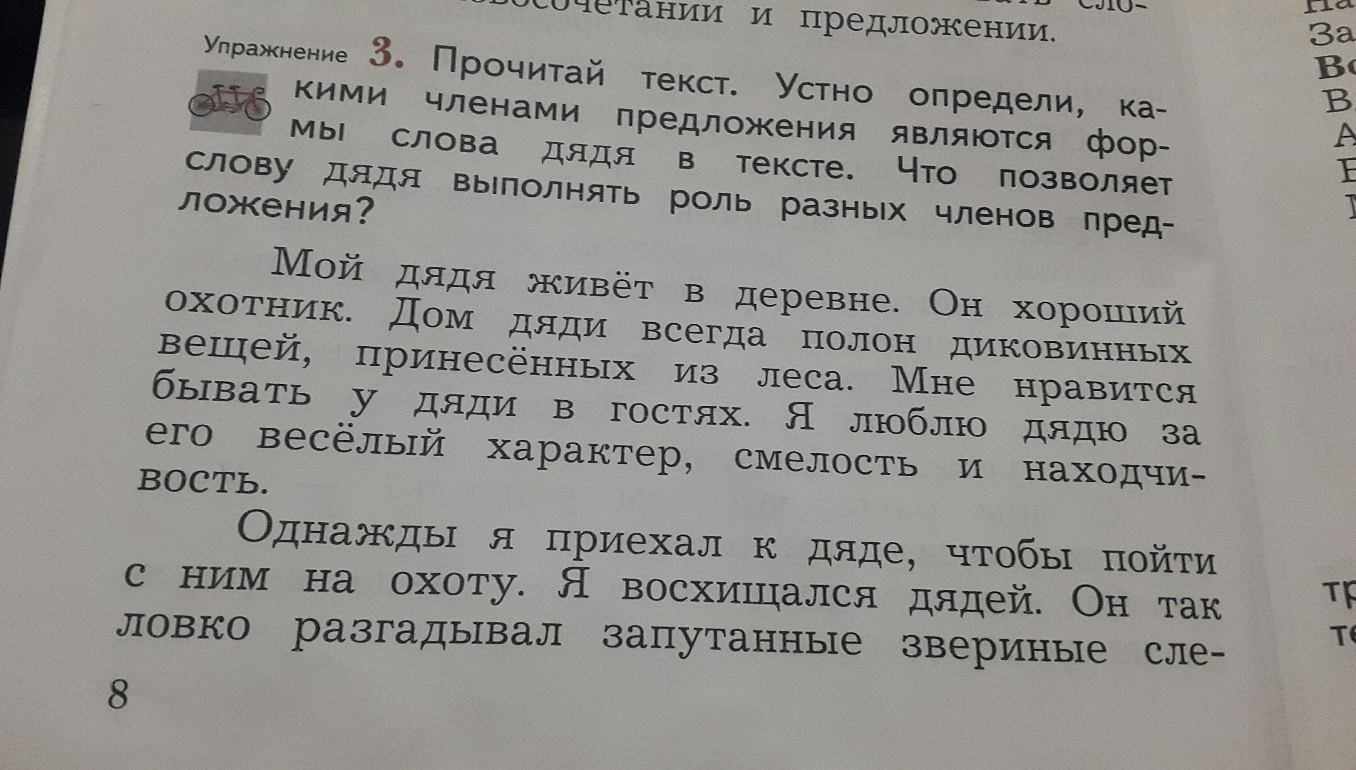 Дядя -Им.п (в предложении поясняется подлежающим), дяди-р.п (в предложении поясняется дополнением), у дяди-р.п(в предложении поясняется дополнение) дядю-в.п (в предложении поясняется дополнением) , к дяде-д.п (в предложении поясняется обстоятельством), дядей-т.п (в предложении поясняется дополнением)