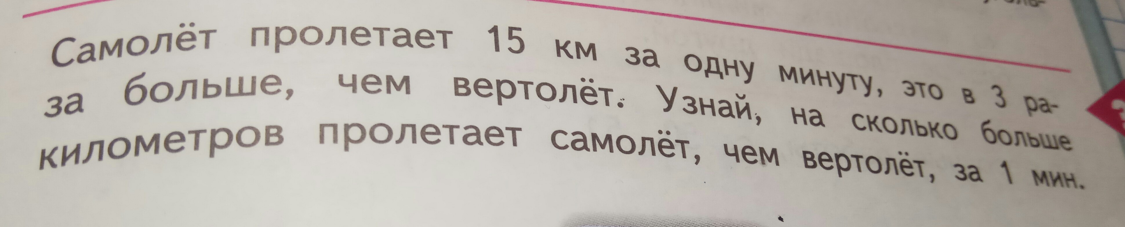 Самолёт - 15 км за 1 мин, в 3 р. больше чем вертолёт.
