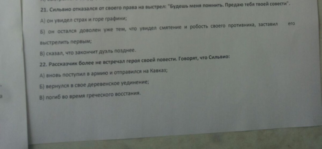21. Б) Он увидел графа испуганным, смятенным, униженным. Этого герою хватило с лихвой. Он достиг своей цели с первой дуэли, поэтому стрелять ему было уже не обязательно.
