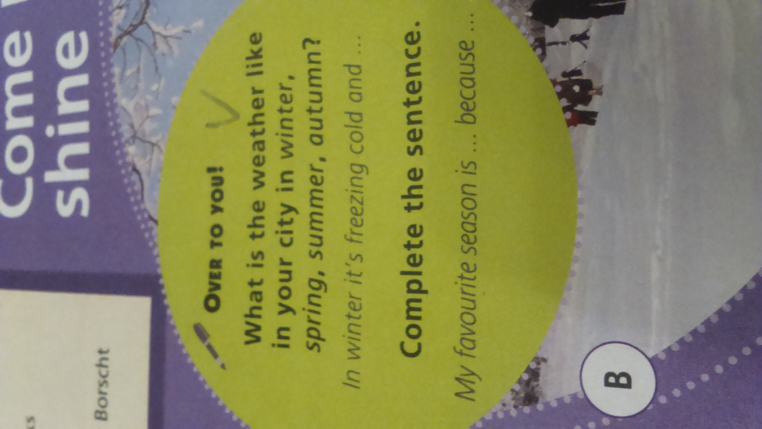 1.In winter it is freezing cold and outside is very cold. 2.In autum it is rains and cold winds often come. 3.In spring it is warm wind and flowers blossom. 4.In summer there is a lot of sun.