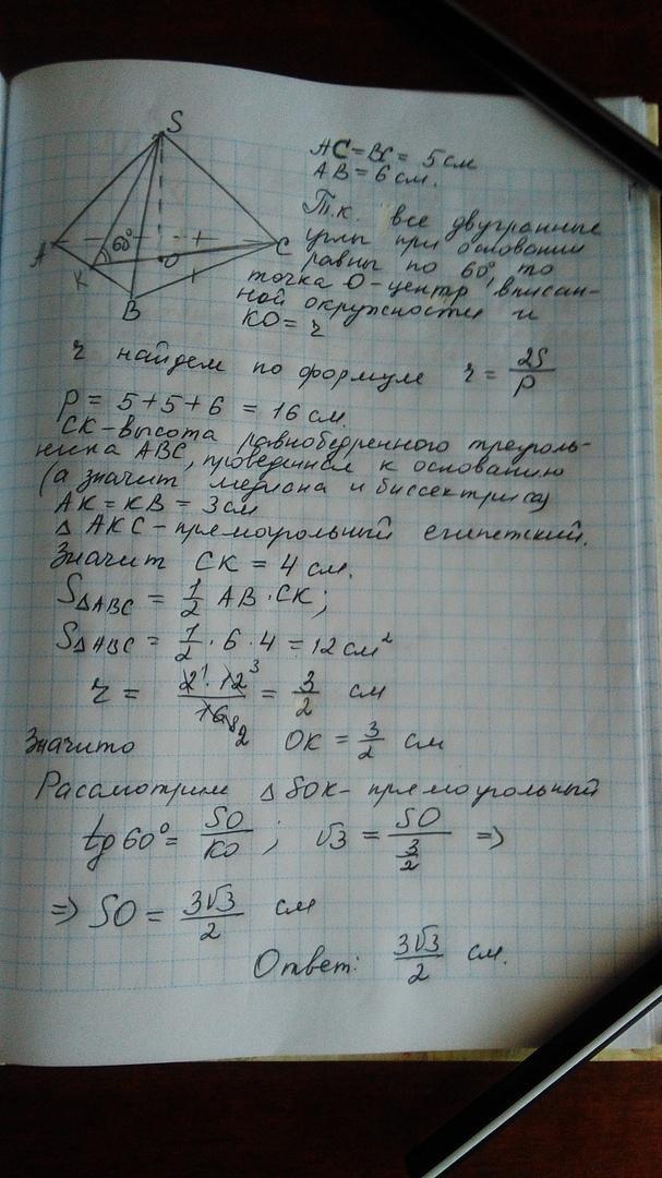 Основа піраміди - трикутник зі сторонами 5см, 5см і 6см, а всі двогранні кути при сторонах основі дорівнюють по 60 градуcів. Знайдіть довжину висоти піраміди