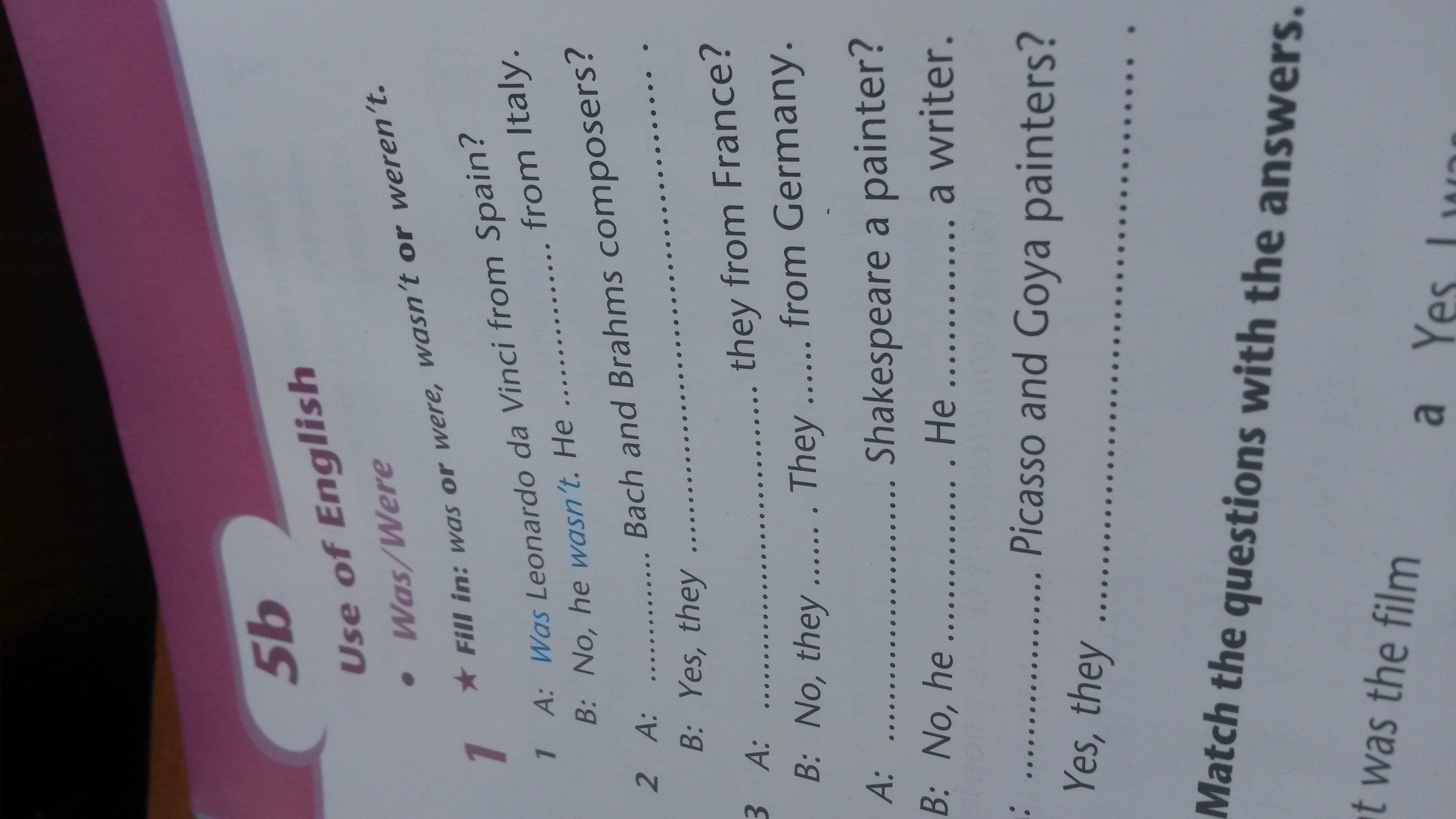 2. were, were, 3. were, weren't, were, 4. was, wasn't, was, 5. were, were