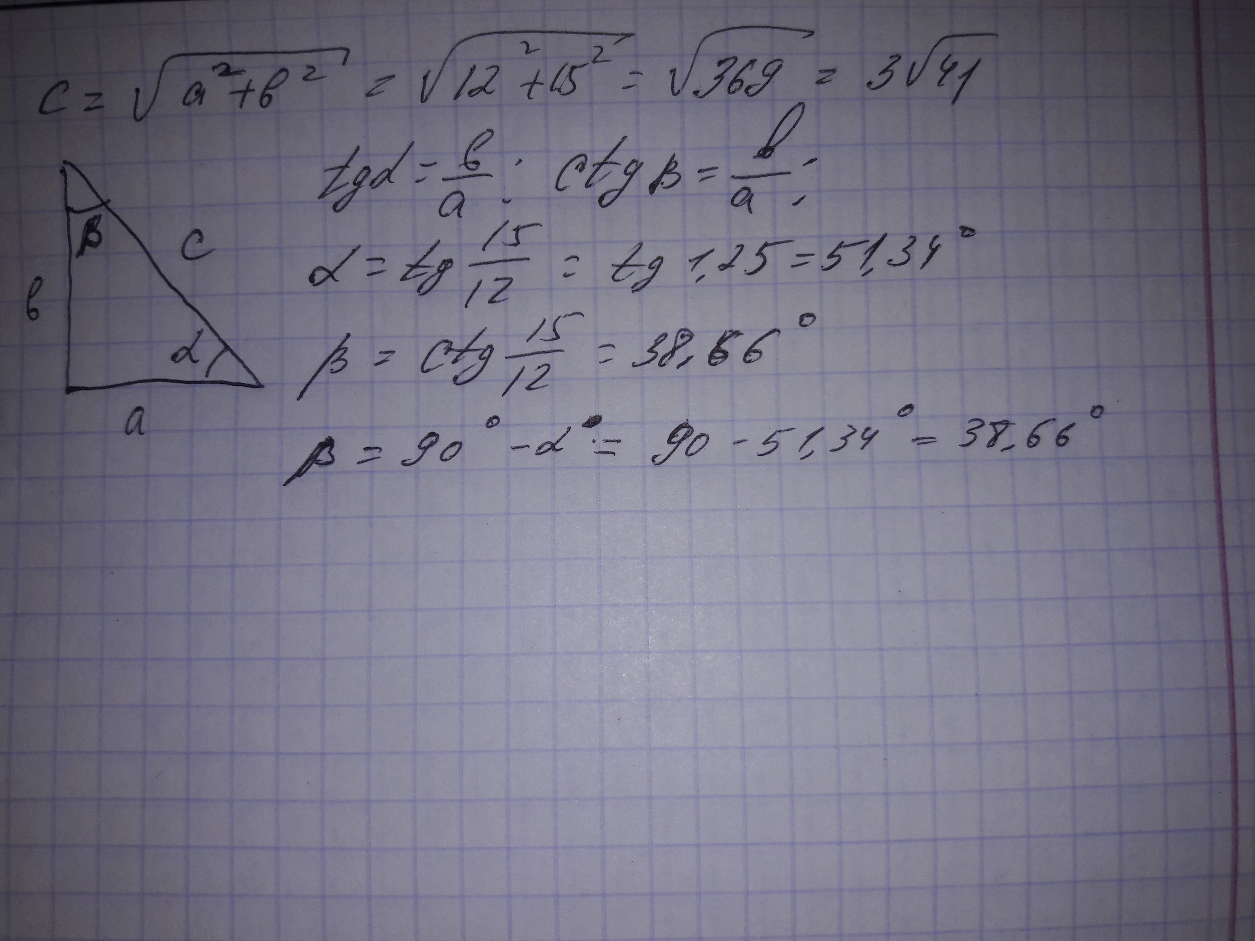 Через катеты a=12 и b=15 прямоугольного треугольника выразите острые углы и гипотенузу и найдите их значения.