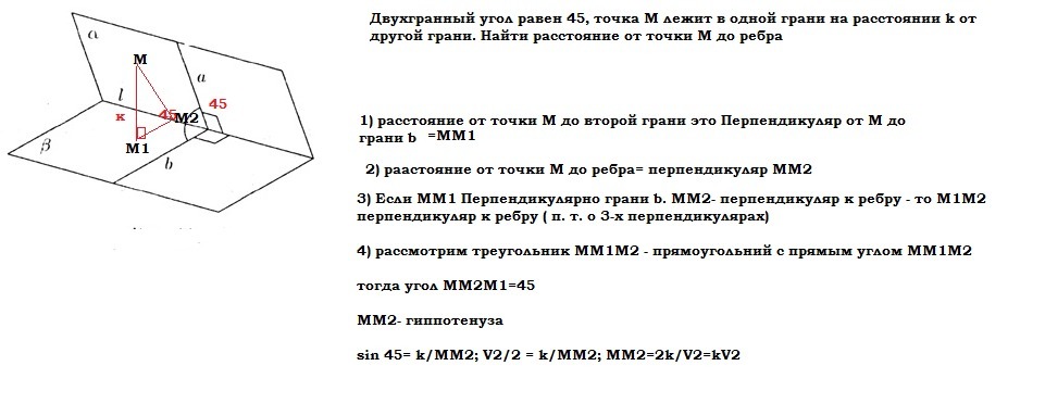 Двухгранный угол равен 45, точка М лежит в одной грани на расстоянии k от другой грани. Найти расстояние от точки М до ребра
