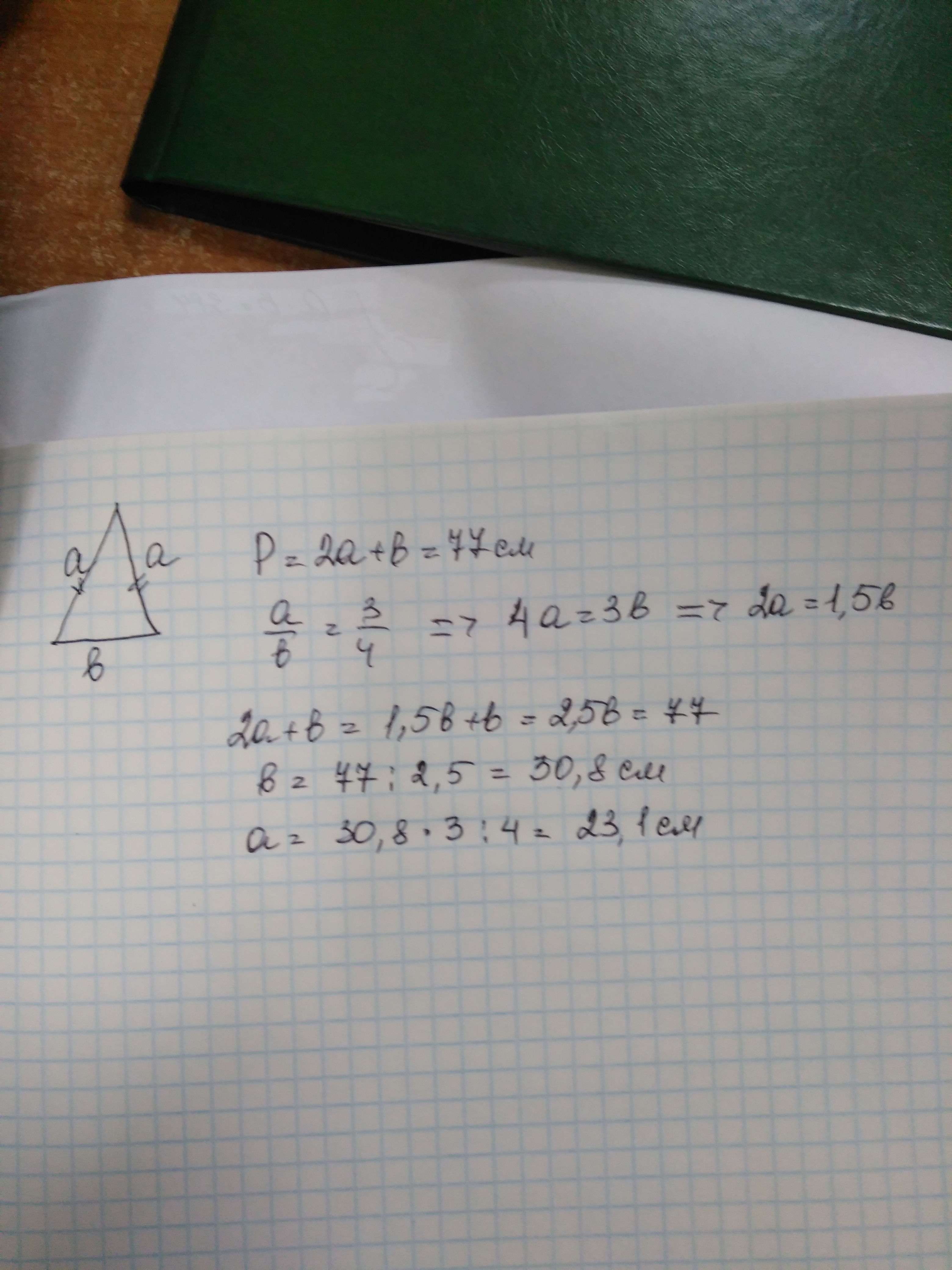 В равнобедренном треугольнике с периметром 77 см боковая сторона относится к основанию как 3:4. Найдите стороны треугольника.