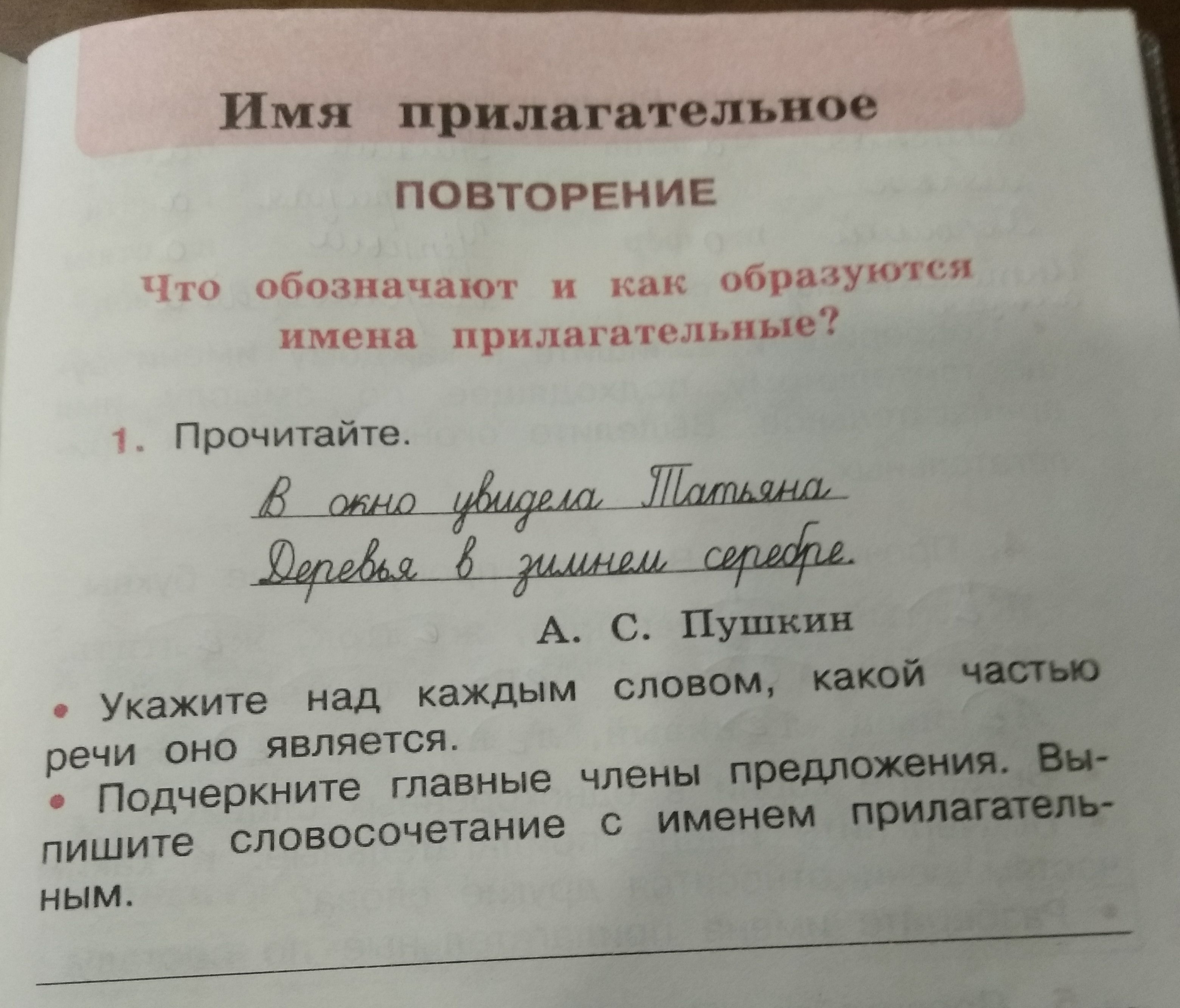 1. В- предлог, окно- обстоят., увидела- глагол, Татьяна- сущ., деревья- дополн., зимнем- прилаг., серебре- дополн.