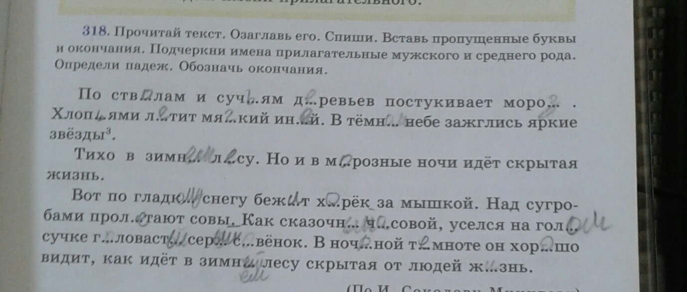 Прилагательные мужского рода :мягк[ий]-им.п; зимн[ем]-предл.п; гладк[ому]-дат.п; сказочн[ый]-им.п; гол[ом]-предл.п; головаст[ый]-им.п,сер[ый]-им.п; зимн[ем]-предл.п.