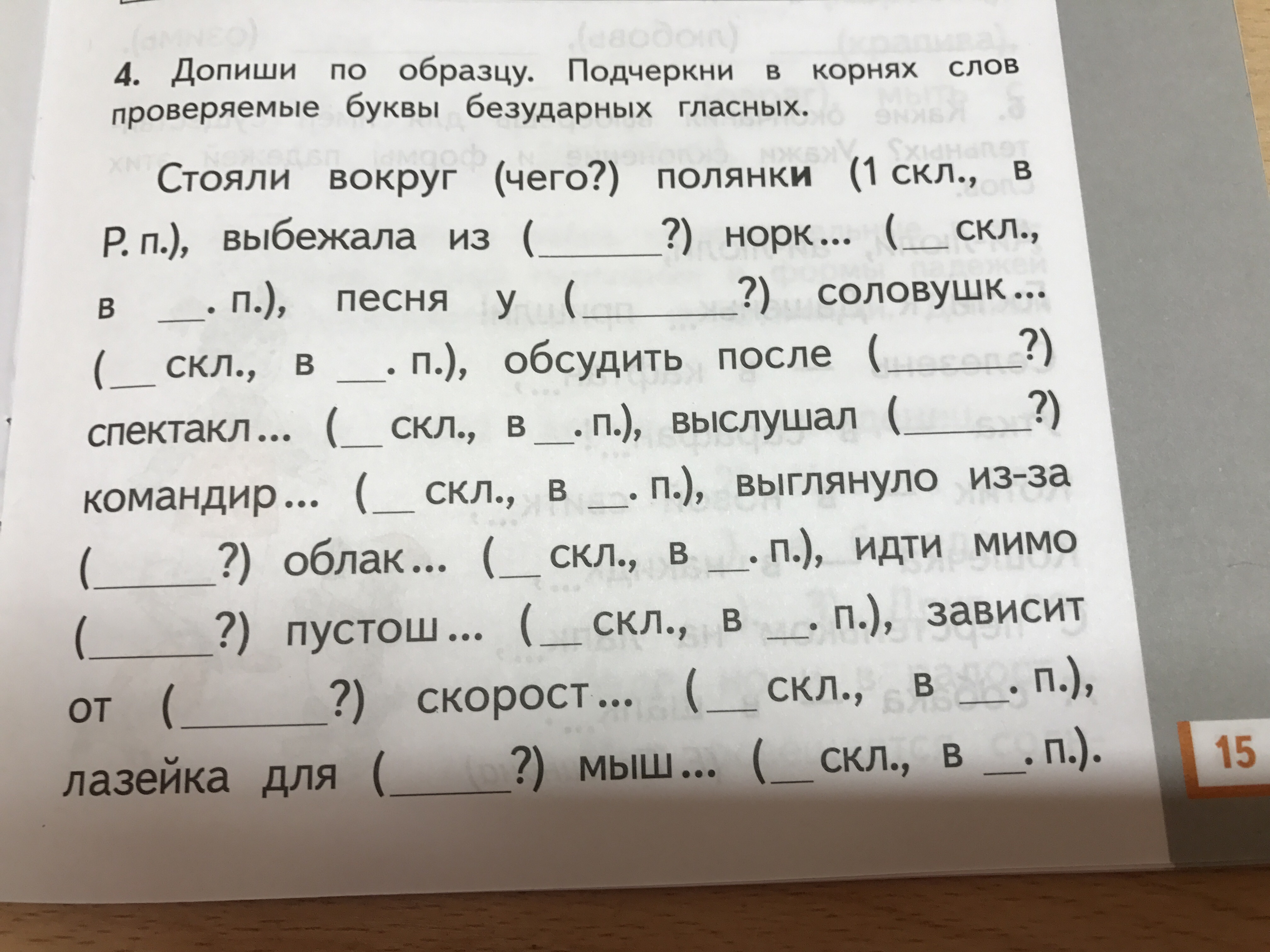выбежала из (чего?) норки (1 скл. в Р.п.), песня у (кого?) соловушки (1скл. в Р.п.), обсудить после (чего?) спектакля (2скл. в Р.п.), выслушал (кого?) командира (2скл. в Р.п.), выглянуло из за (чего?) облака (2скл. в Р.п.), идти мимо (чего?) пустоши (3 скл. в Р.п), зависит от (чего?) скорости (3скл. в Р.п.), лазейка для (кого?) мыши (3скл. в Р.п.)