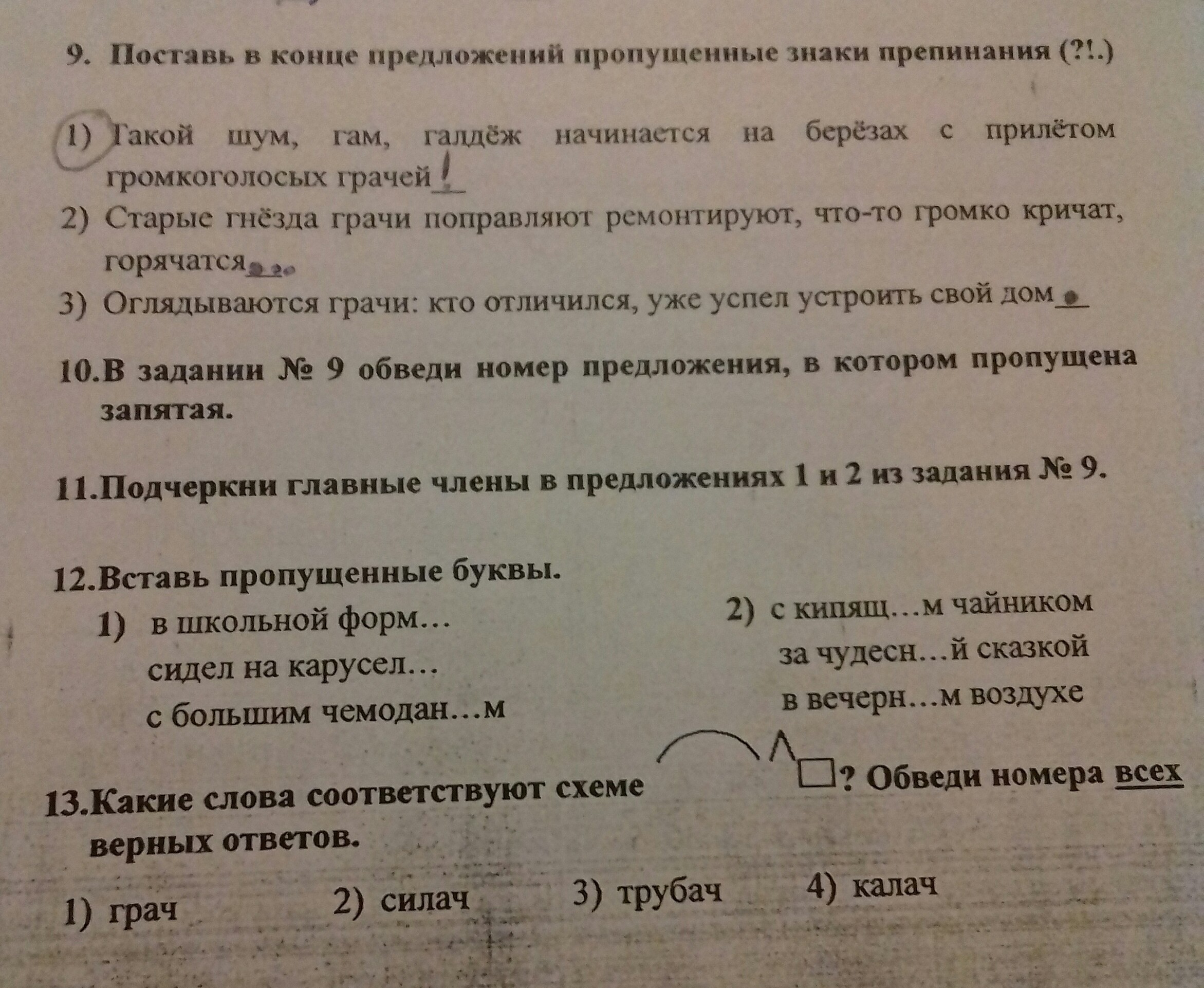 12. 1) в школьной форме, сидел на карусели, с большим чемоданом; 2) с кипящим чайником, за чудесной сказкой, в вечернем воздухе