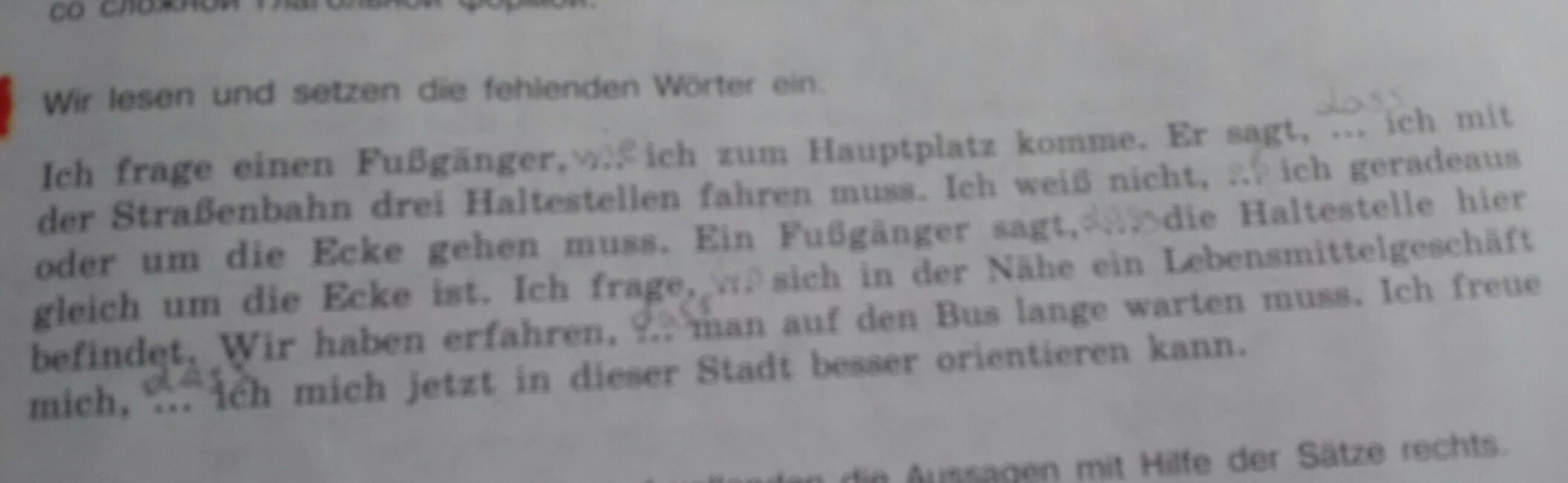 Я спросил пешехода, как я могу добраться до главной площади. Он сказал, что я должен проехать три остановки на трамвае. Я не знаю, должен ли я идти прямо или свернуть за угол. Пешеход сказал, что остановка прямо здесь за углом. Я спросил, где здесь по близости найти продуктовый магазин. Мы узнали, что автобус нужно ждать долго. Мне радостно, что теперь я могу лучше ориентироваться в этом городе.