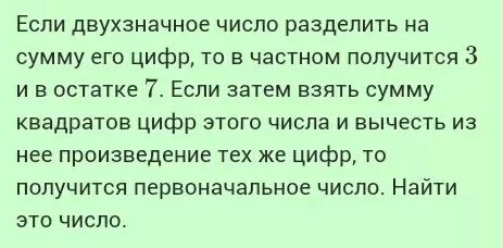 Если двухзначное число разделить на сумму его цифр, то в частном получится 3 и в остатке 7. Если затем взять сумму квадратов цифр этого числа и вычесть из нее произведение тех же цифр, то получится первоначальное число. Найти это число.