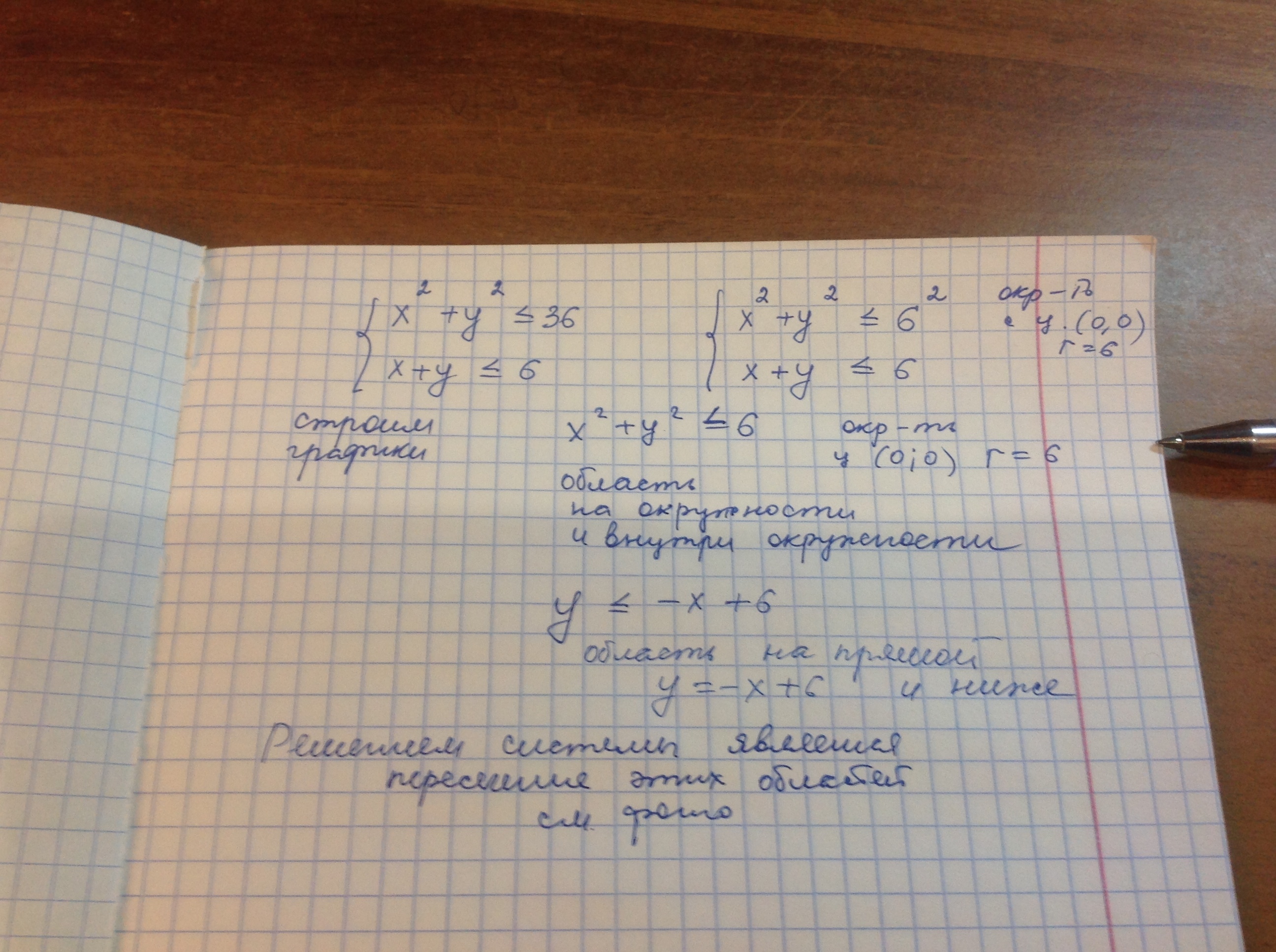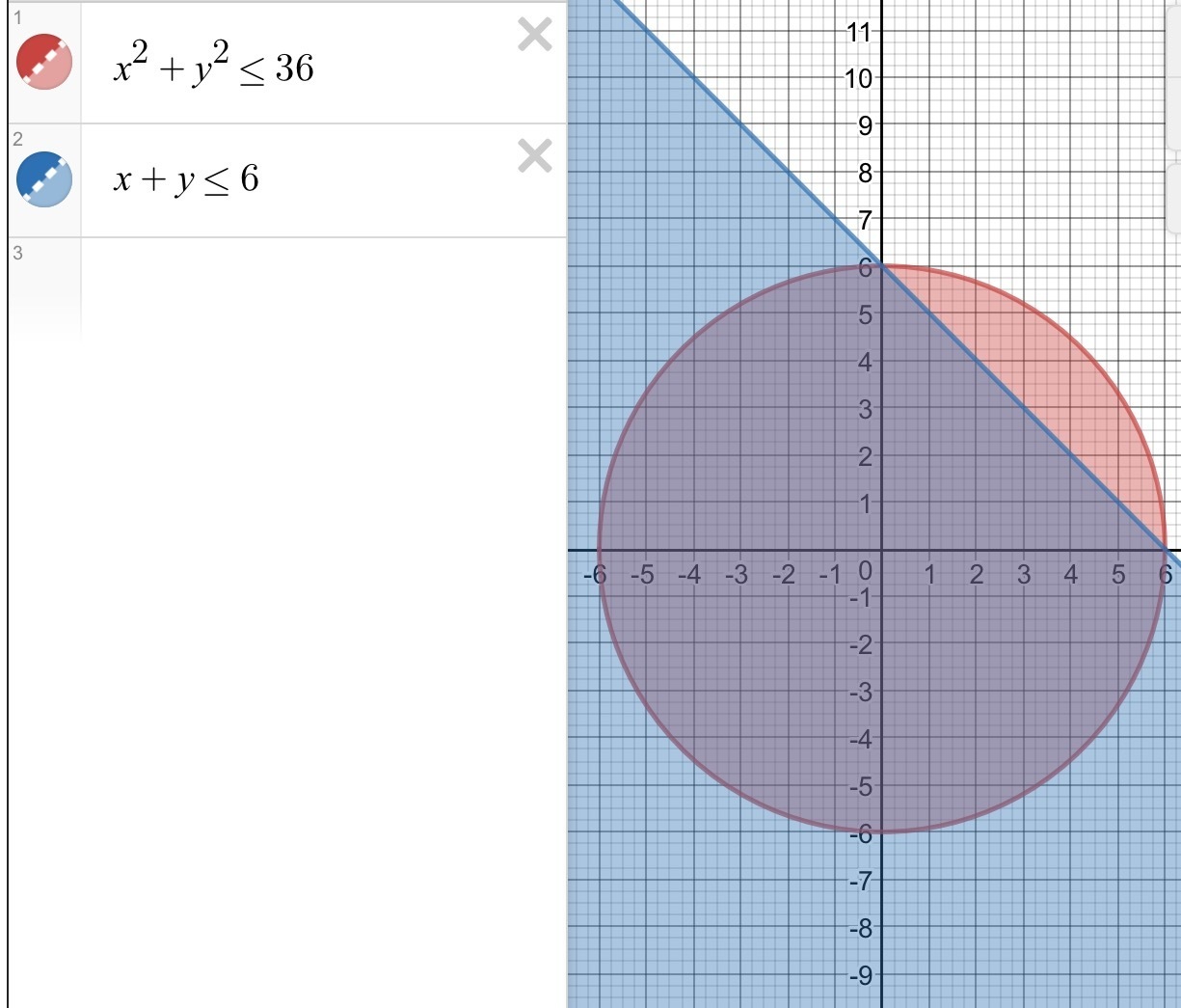 изобразите на координатной плоскости множество решений неравенства X^2 + У^2 меньше или равно 36 х+у меньше или равно 6