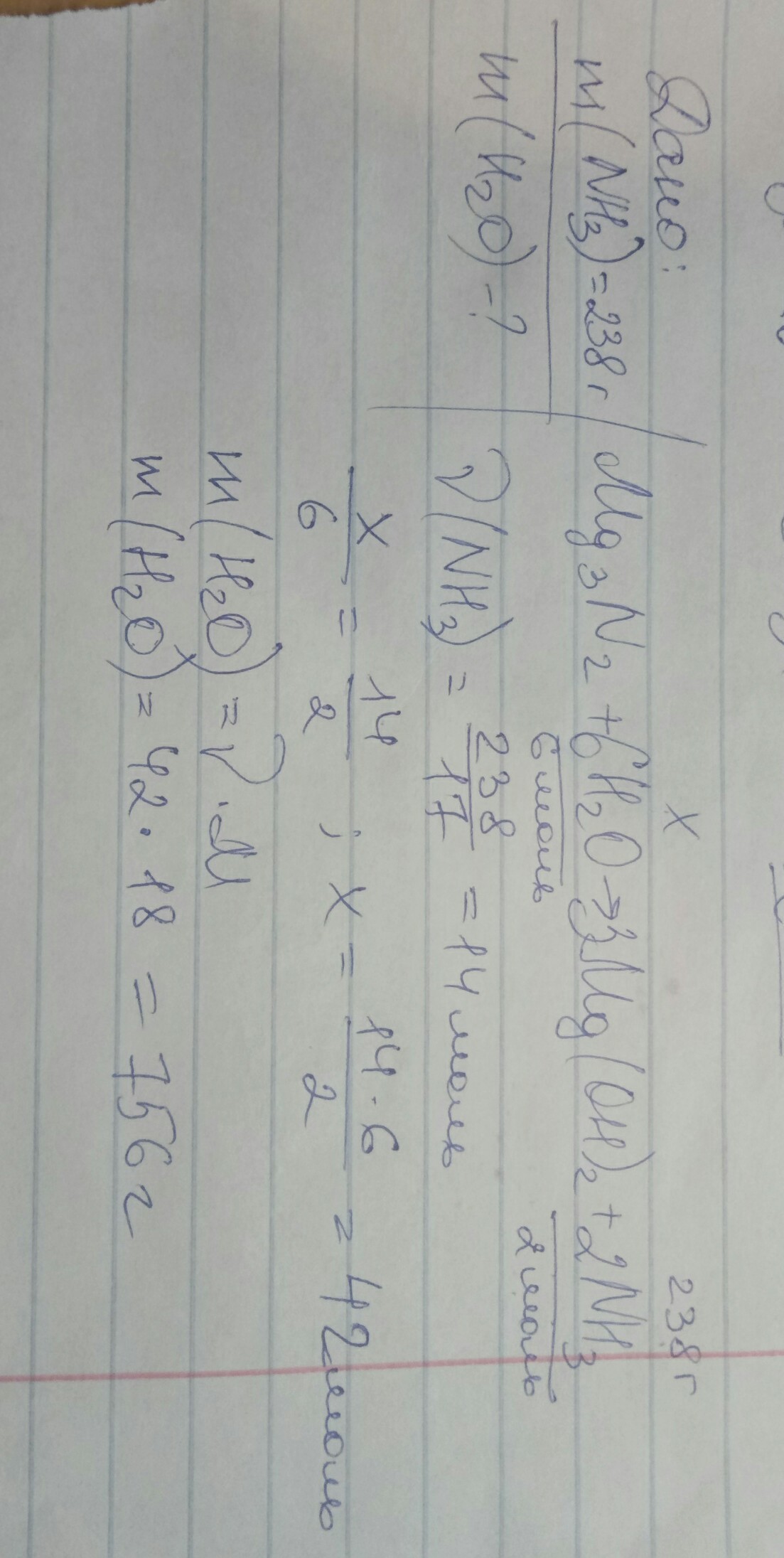 Определите, какая масса воды вступила в реакцию если образовалось 238г NH3.