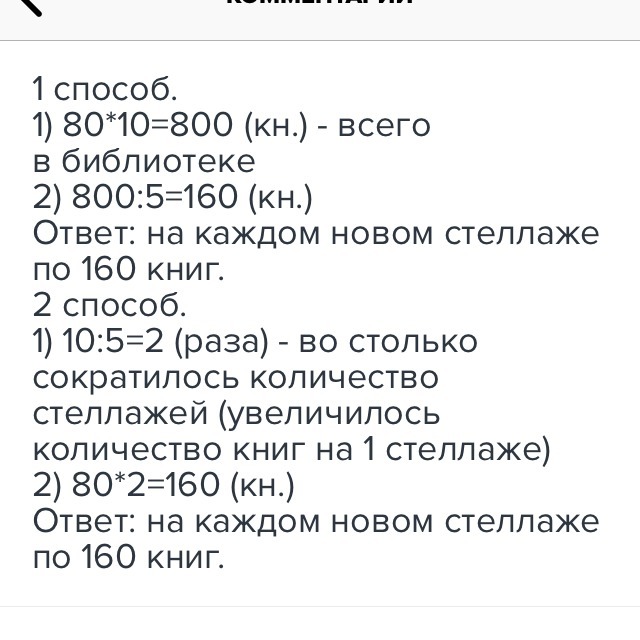 До ремонта в библиотеке книги располагались на 10 стеллажах по 80 книг в каждом.После ремонта эти же книги разместили на 5 новых стеллажах поровну в каждом.Сколько книг на каждом новом стеллаже