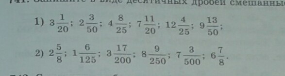 1) 3,1/20=3,05. 2,3/50=2,06. 4,8/25=4,32. 7,11/20=7,55. 12,4/25=12,16. 9,13/50=9,26. 2)2,5/8=2,625. 1,6/125=1,048. 3,17/200=3,085. 8,9/250=8,036. 7,3/500=7,006. 6,7/8=6,875.