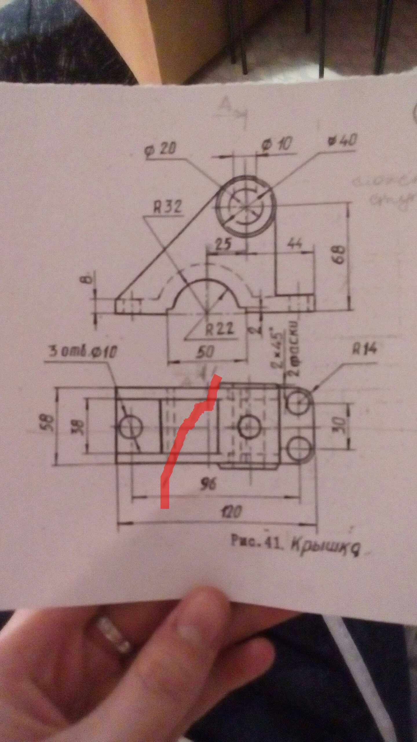 СОС, обращаюсь с черчением уже второй раз. Помогите, пожалуйста, сделать сечение (я выделила его красным). Его на рисунке плохо видно, но оно должно быть прямой линией, а не как я провела (рука тряслась).