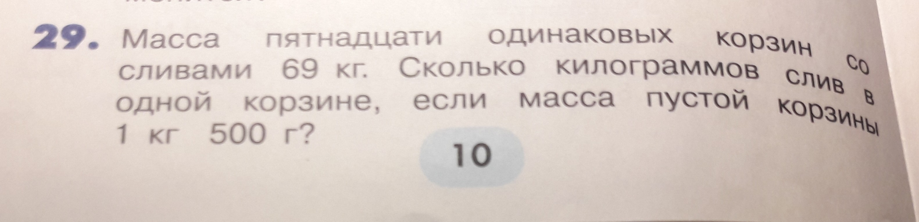 Масса 15 одинаковых корзин со сливами 69 кг. Сколько килограммов слив в 1 корзине, если масса пустой корзины 1 кг 500 г?