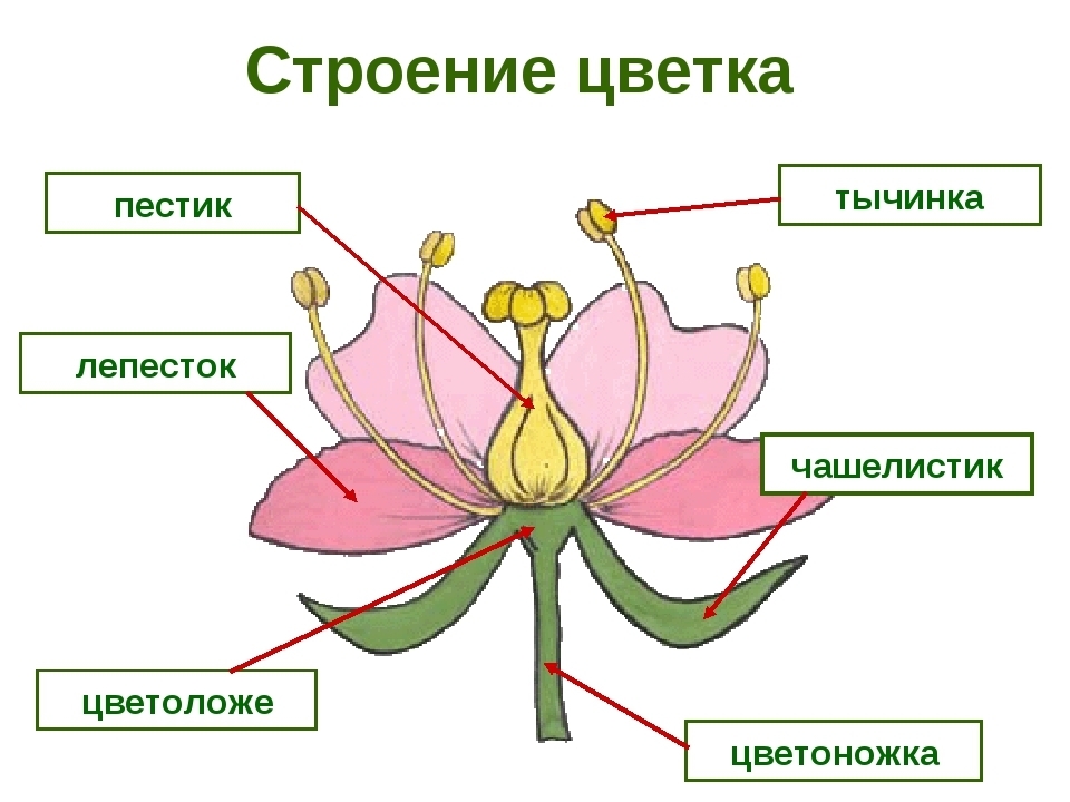 Цветок — орган семенного размножения, представляет собой укороченный видоизмененный побег с ограниченным ростом. Часть стебля, несущая на себе цветок, т. е. под цветком, называется цветоножкой. У некоторых однодольных растений на цветоножке бывает один, у двудольных — два и больше маленьких верхушечных листиков, получивших название прицветников. У цветков многих растений они отсутствуют. Расширенная часть цветка называется цветоложем. Для него характерно наличие слабо выраженных междоузлий.