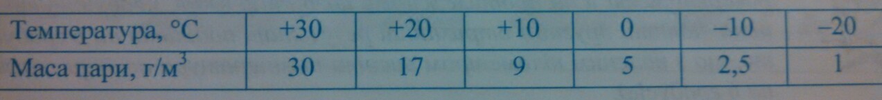 Сколько водяного пара содержится в 4 м3 при температуре -10 ° С, если его относительная влажность составляет 40%. Подсказки: зависимость между температурой воздуха и количеством водяного пара в насыщенном воздухе (относительная влажность 100%) можно отобразить таблицей:( таблица на фото).!