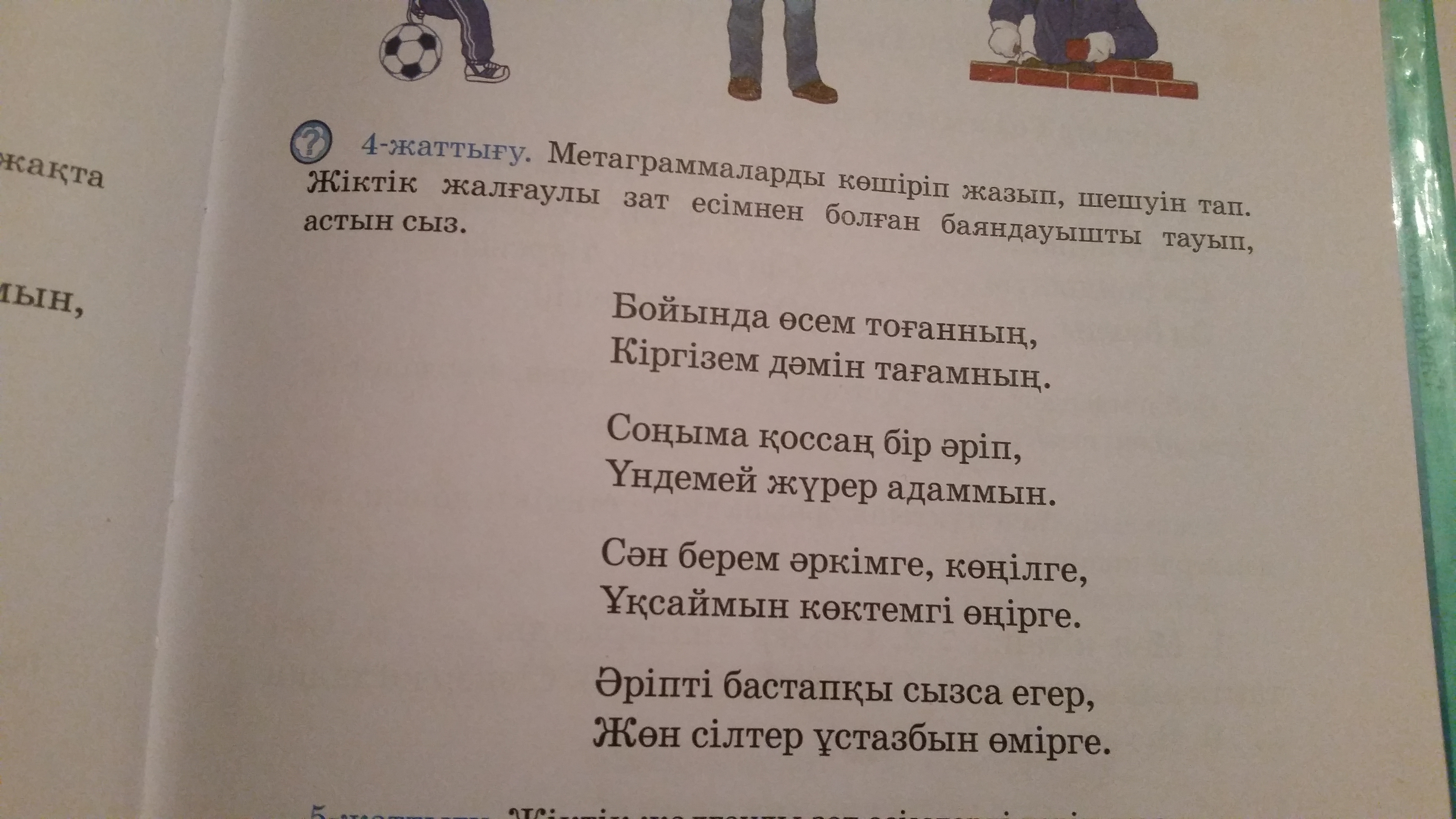 Бойында өсем тоғанның Кіргізем дәмін тағамның Соңыма қоссаң бір әріп Үндемей жүрер адаммын (жуа-жуас) -------------- Сән берем әркімге,көңілге Ұқсаймын көктемгі өңірге Әріпті бастапқы сызса егер, Жөн сілтер ұстазбын өмірге (мата-ата) -------------