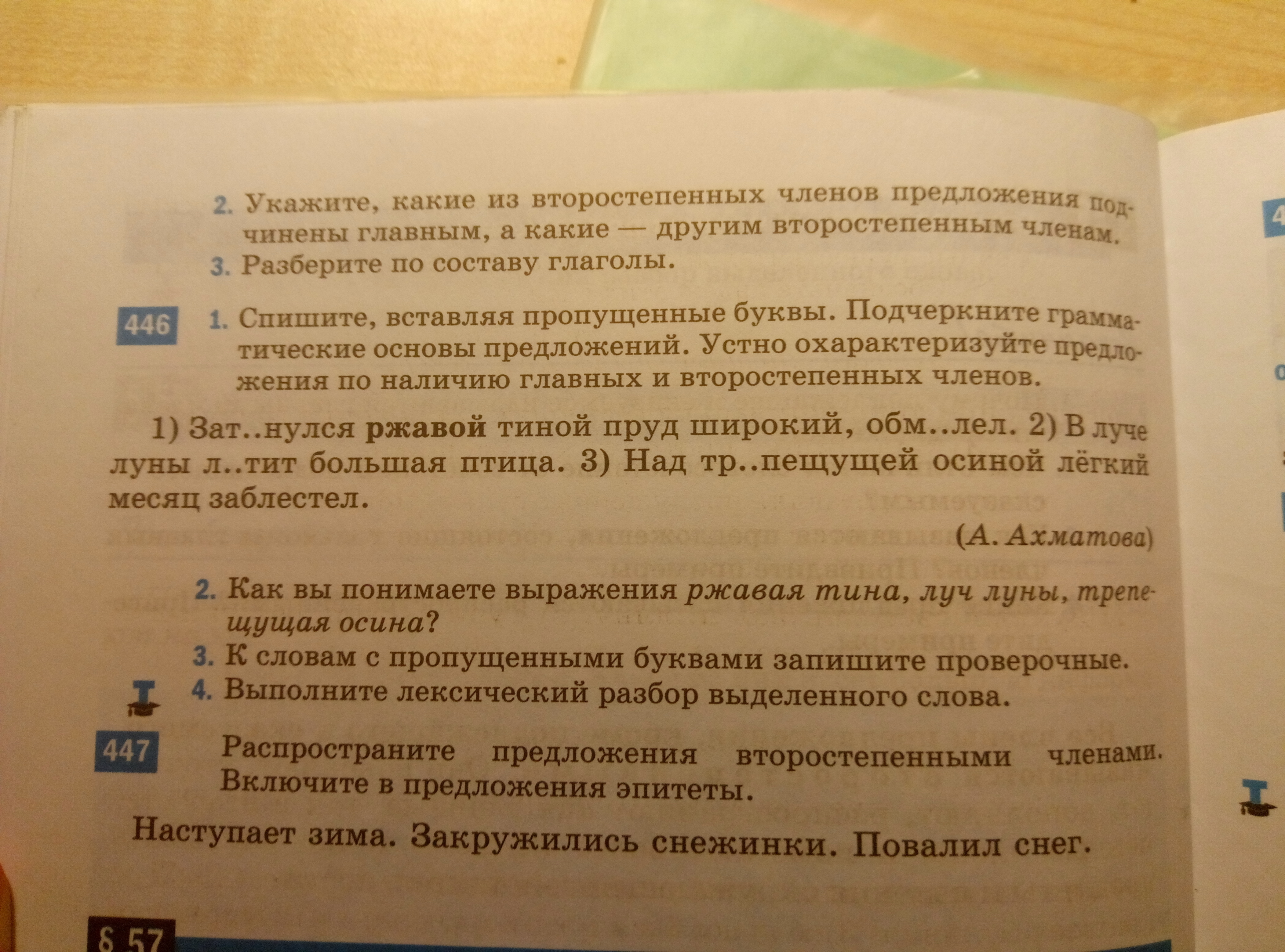 Затянулся ржавой тиной пруд широкий ,обмелел . В луче уны летит большая птица . Над трепещущей осиной легкий месяц заблестел . Затянулся - Тянется . Обмелел - мель . Летит - полёт . Трепещуйщей - трепет .