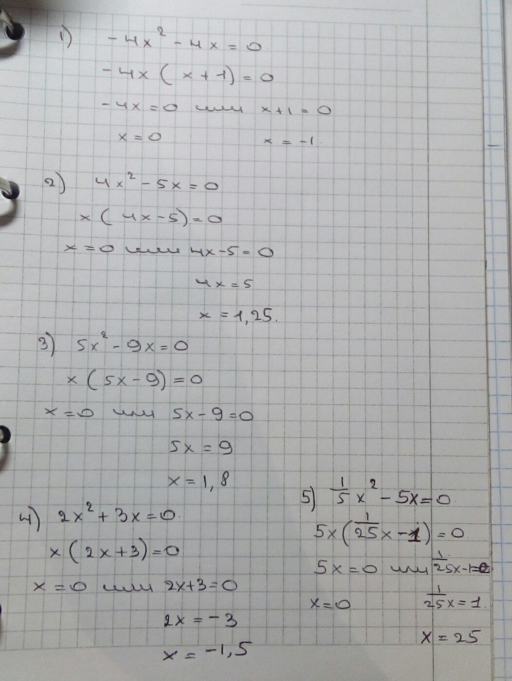 Реши уравнения -4х2-4х=0;4х2-5х=0; 5х2-9х=0; 2х2+3х=0; 1/5х2-5=0 если можно пободробнее расписать