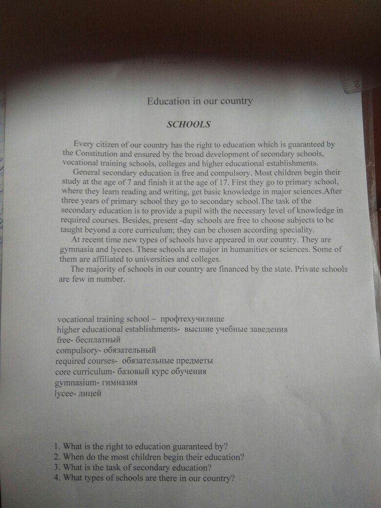 Каждый гражданин нашей страны имеет право на образование, которое гарантируется Конституцией и обеспечивается широким развитием средних школ, школ профессионального образования, колледжей и высших учебных заведений. Общее среднее образование является бесплатным и обязательным. Большинство детей начинают свое обучение в возрасте 7 лет и заканчивают его в возрасте 17 лет. Сначала они отправляются в начальную школу, где учатся читать и писать, получать базовые знания в области крупных наук. После трех лет начальной школы они ходят в среднюю школу. Задача среднего образования состоит в том, чтобы предоставить учащемуся необходимый уровень знаний на требуемых курсах. Кроме того, современные школы могут выбирать предметы, которые будут преподаваться за пределами основной учебной программы; они могут быть выбраны по специальности. В последнее время в нашей стране появились новые типы школ. Это гимназия и лицеи. Эти школы являются основными в области гуманитарных наук или наук. Некоторые из них связаны с университетами и колледжами. Большинство школ в нашей стране финансируется государством. Частных школ мало.