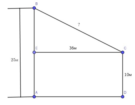 две сосны растут на расстоянии 36 м одна от другой высота одной сосны 25 м а другой 10 м. найдите расстояние в метрах между их вершинами