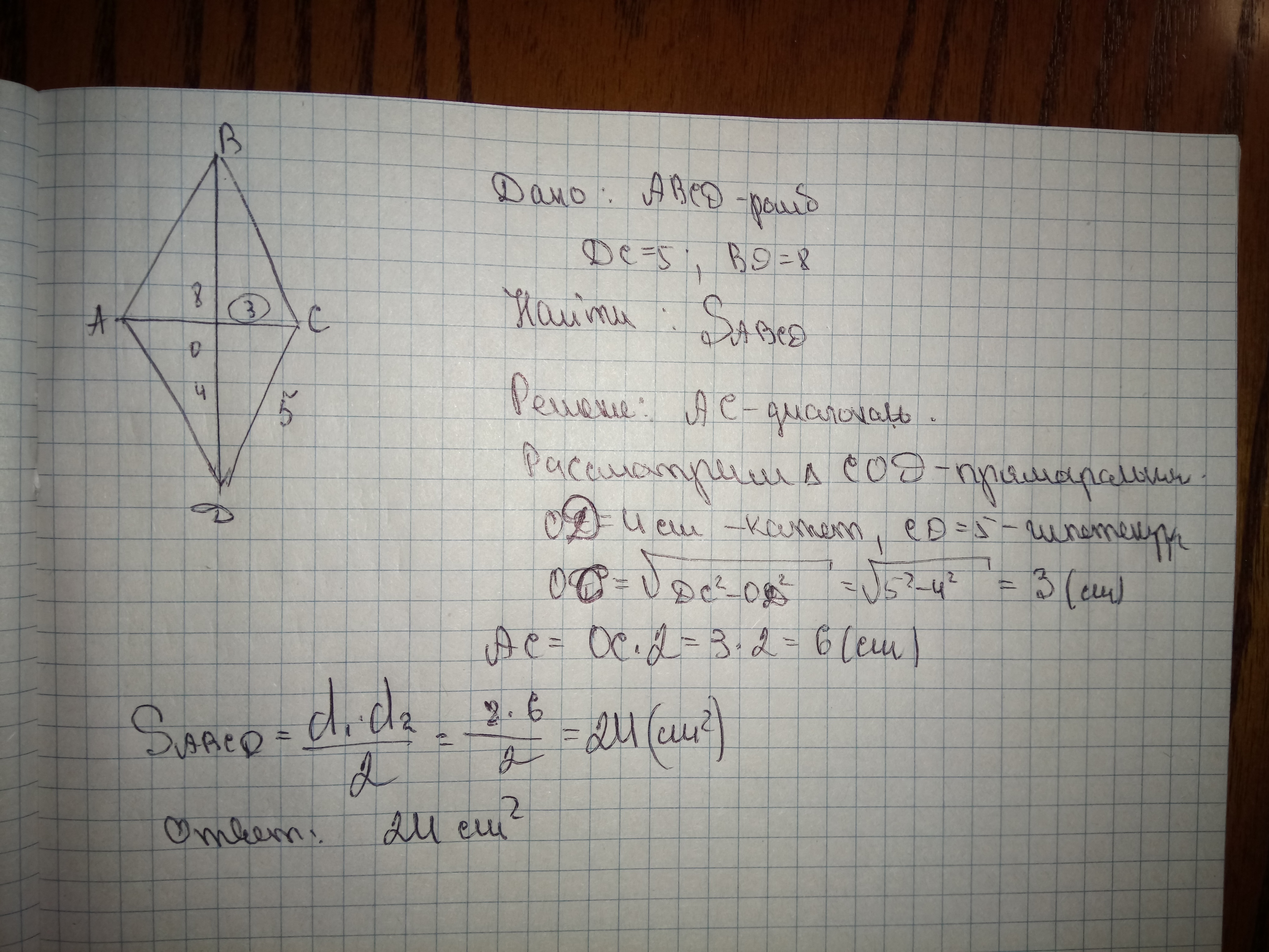 Найдите площадь ромба ABCD (в см2), если известно, что CD=5, а BD=8 см.