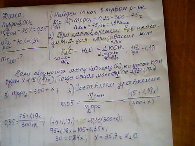 Сколько г. К2О необходимо добавить к 25% раствору КОН массой 300 г., чтобы процентное содержание нового раствора стало 35%.