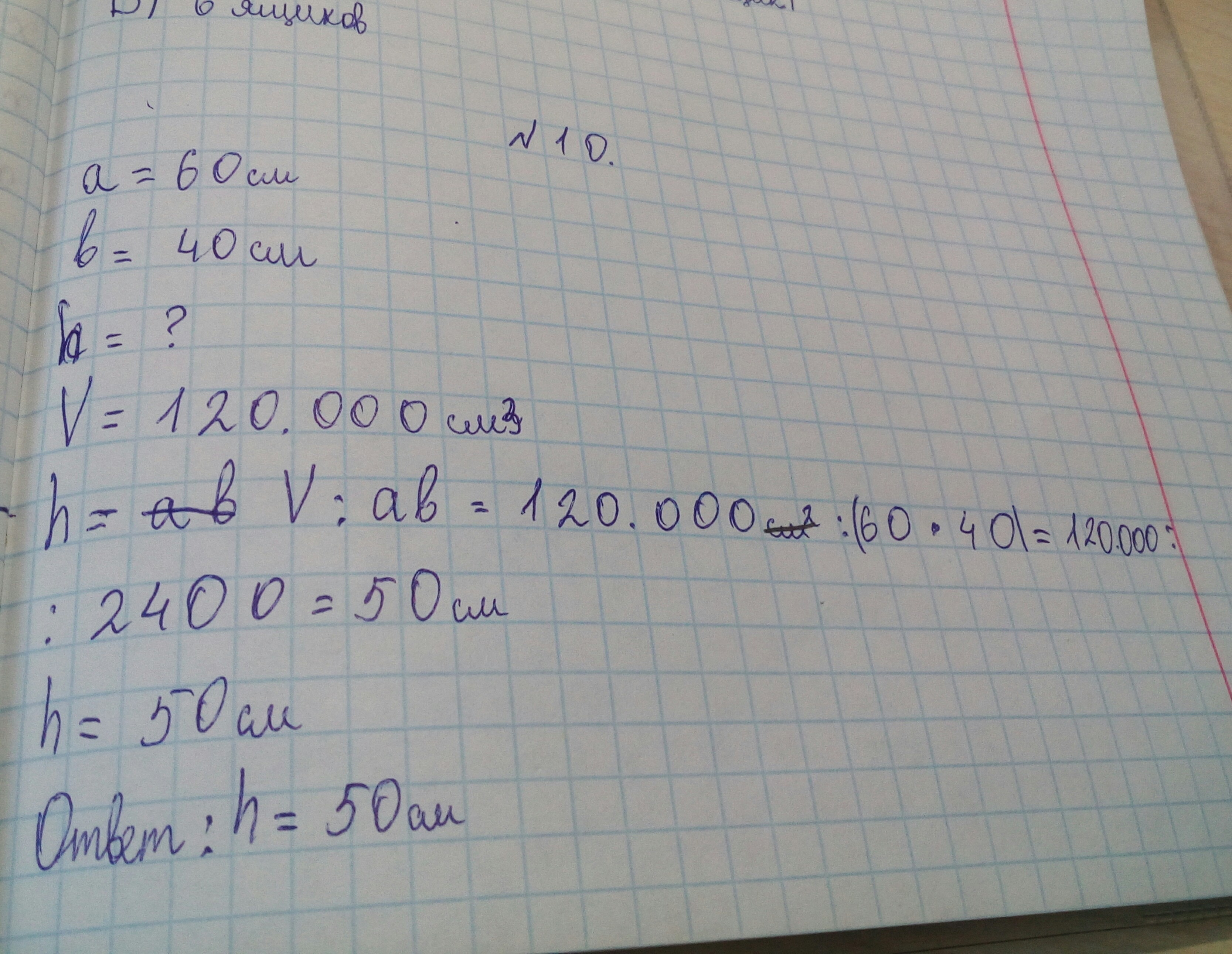 Объём аквариума равен 120000см3. Найдите высоту аквариума, если его длина равна 60см, а ширина 40см