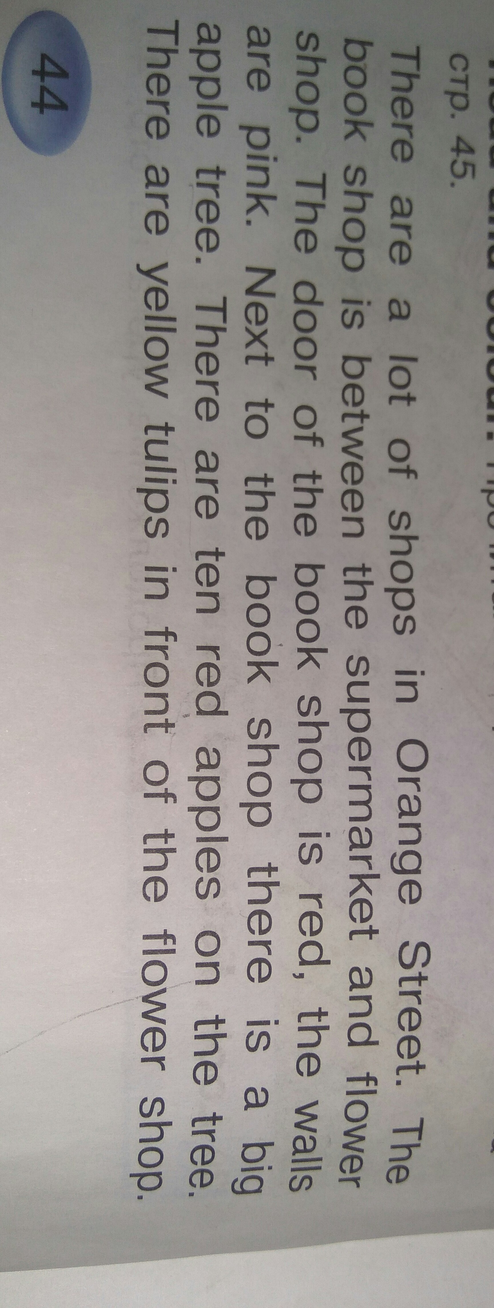 много магазинов на Ораньжевой улице. книжный магазин между супермаркетом и цветочным магазином. дверь книжного магазина красная,стена розовая. рядом с книжным магазином большая яблоня. на яблоне 10 красных яблок. перед цветочным манвзином жёлтые тюльпаны.