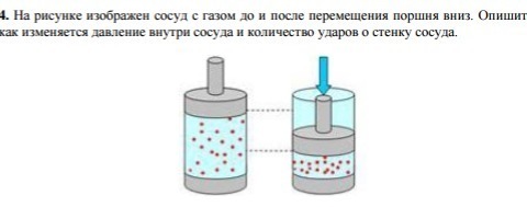На рисунке изображен сосуд с газом до и после перемещения поршня вниз. Опишите
