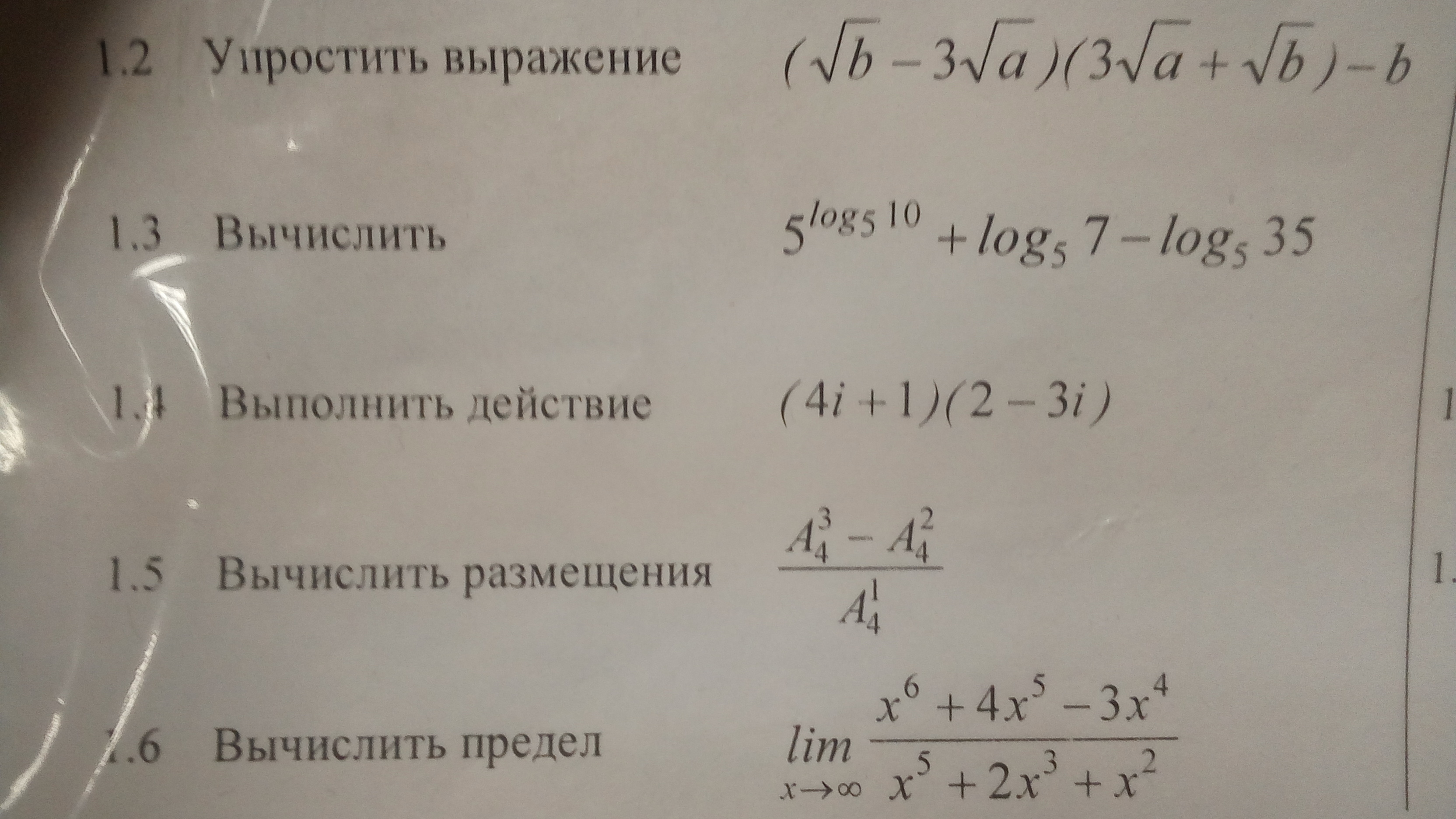 задание 1.6 вычислить предел:так как х стремится к бесконечности,то вместо х везде поставь бесконечность,а так как в результате получится бесконечно большое число,то ответ будет просто знак бесконечности
