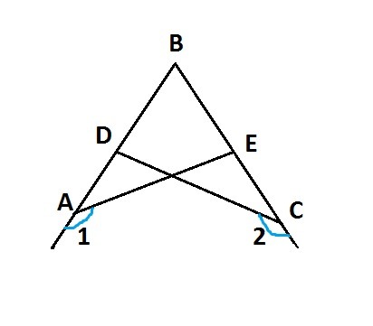 угол1=угол2, уголВАЕ=180-угол1, уголВСД=180-угол2, уголВАЕ=уголВСД, треугольник АВЕ=треугольникВСД по двум углам (уголВАЕ=уголВСД, уголВ-общий) и прилегающей стороне АВ=ВС, тогда АЕ=СД