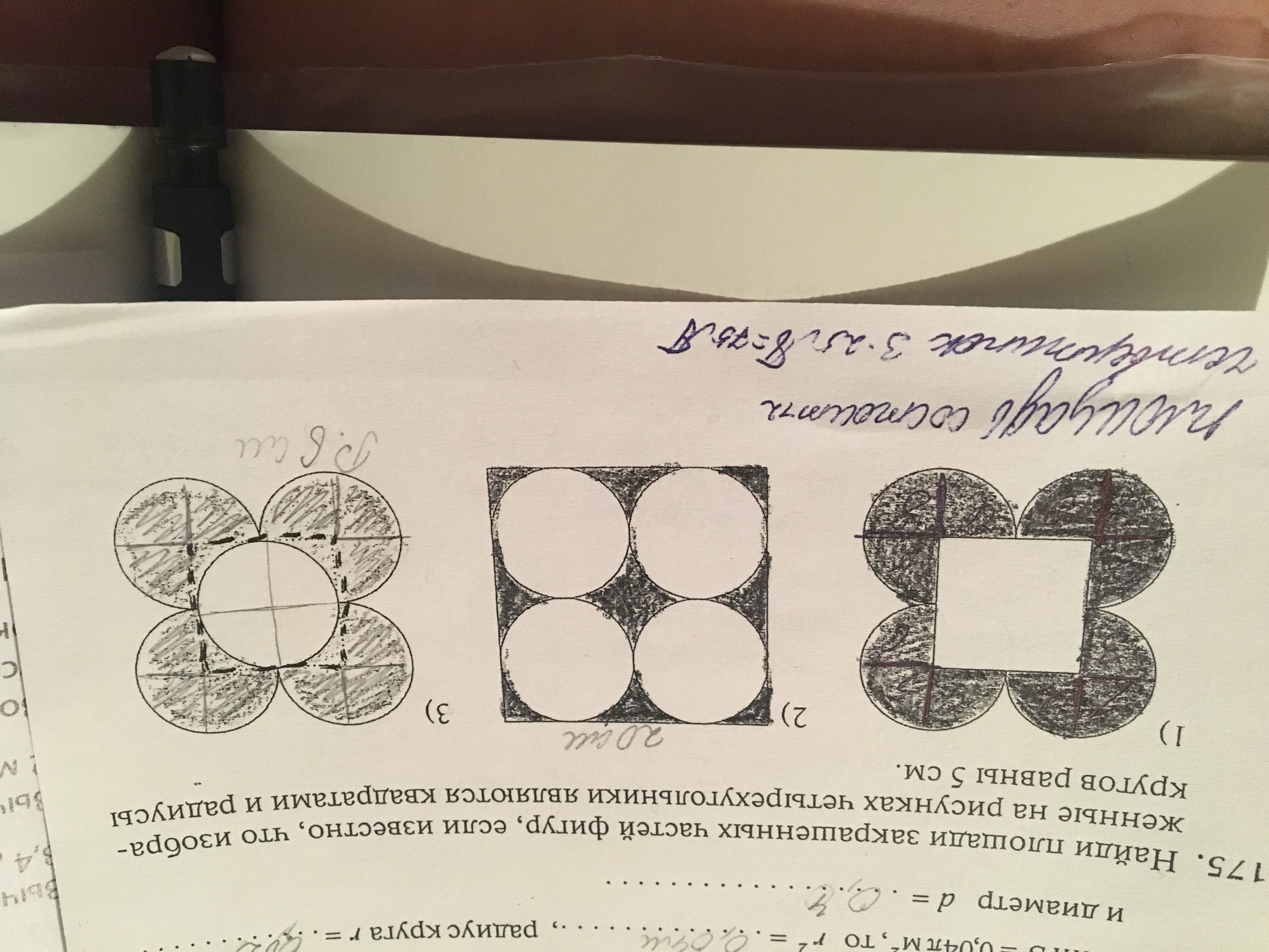 Найти площади закрашенных частей фигур,если известно,что изображённые на рисунках четырёхугольники являются квадратами и радиусы кругов равны 5 см.
