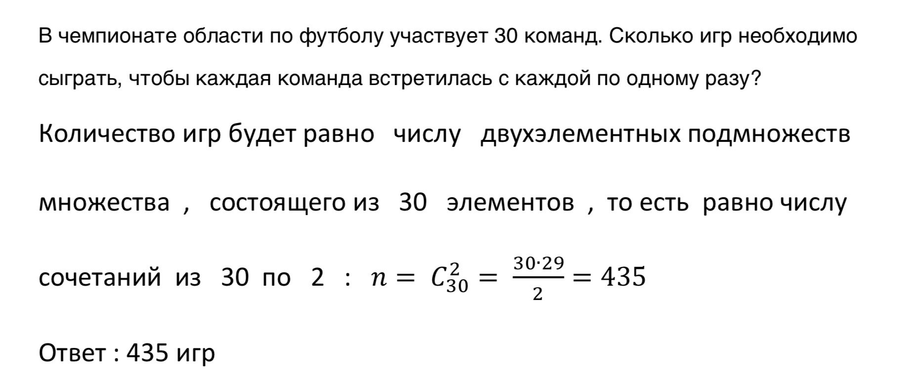 В чемпионате области по футболу участвует 30 команд. Сколько игр необходимо сыграть, чтобы каждая команда встретилась с каждой по одному разу?